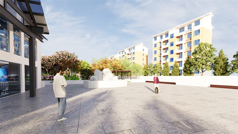 公共卫生区位于娱乐广场与儿童游乐区北侧,重新修缮建筑并铺装防滑石防止滑倒。