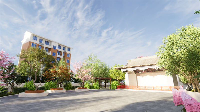 广场活动区包括主广场与娱乐广场。本次设计没有更改主广场的位置,但增高改造了主广场售卖部,增加了购买与出售的面积,做到满足人们的消费需求。在主广场东侧,重新修整假山石后方植被,增添观花观叶植被,做到四季有景可观,为人们带来新的景观体验。娱乐广场区,保留戏台原有建筑,拓宽戏台前方场地,形成又一个娱乐广场。在有演出时可容纳人群观赏,没有演出时做集会活动场地,满足人们集会交流的需求。娱乐广场南侧布置三座带有座椅的树池,既作为观赏景色,亦作为休闲座椅供人们休憩。