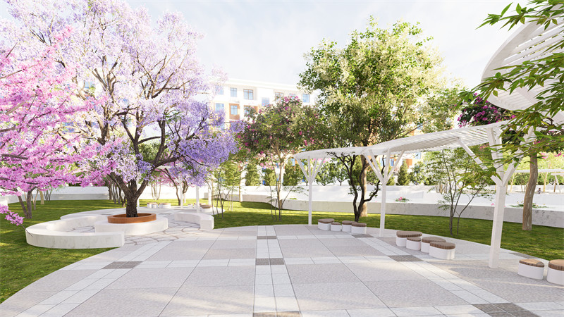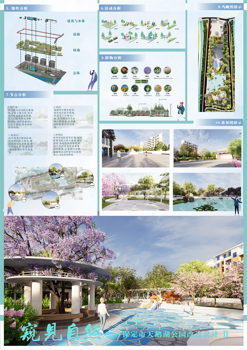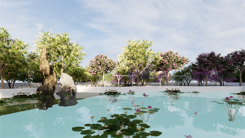 在休闲观景台与儿童乐园之间,去除原本的饲养畜牧区,拓宽观景台原有区域,加高原本的围栏防止落水事件。增添廊架与休息座椅,便于休闲赏景。修缮水景,增添景观石作主体景观,种植水景植物,养殖观赏鱼增添风景趣味。在公园东部的休闲观景区,拓宽休闲区原有区域,修缮观景亭。铺装防滑石防止雨天滑倒,增添廊架、休闲座椅与观花树。使人们无论是在在享受林间静谧,还是进行太极瑜伽等活动时皆可以放松身心,与自然同呼吸。