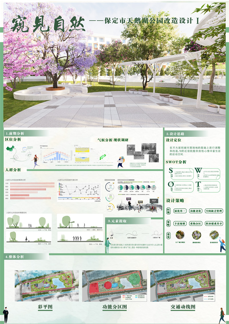 以维护自然为中心,以重构生活为双翼,本次设计旨在改造老旧公园的基础上为居民提供接近自然享受自然的场所。