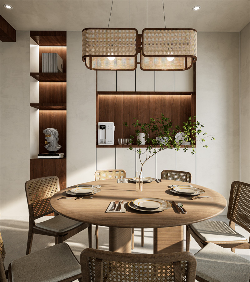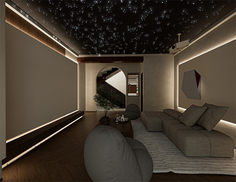 光线是诧寂风别墅设计的关键因素之一。自然光的运用能够凸显材质的真实质感,带来温暖、柔和的氛围。室内照明设计可以选择暖黄色的光源,避免强烈的直射灯,营造柔和的光线效果。可以在墙面安装间接光源,通过光线反射营造出柔和的氛围。在夜间照明上,使用纸灯笼、亚麻布灯罩等,增添空间的自然朦胧感,进一步强化安宁氛围。