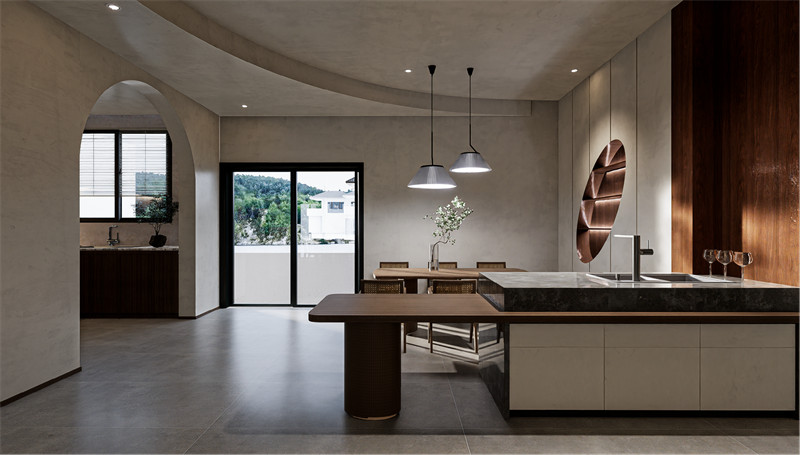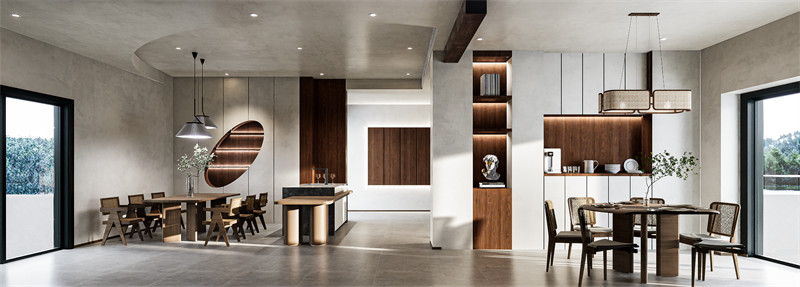 在空间布局上,诧寂风崇尚开放与流动,避免过多的分割墙体。别墅的设计可以通过开放的布局,使得室内与自然环境之间建立更紧密的联系。大面积落地窗或推拉门设计是必不可少的元素,能够让光线自由流入,并与室外景观融为一体。将不同功能区自然过渡,使空间有延伸感。为了保持视觉上的简洁和空旷,家具的数量控制在适当范围,重视每一个元素在空间中的存在感,而不堆砌杂物。