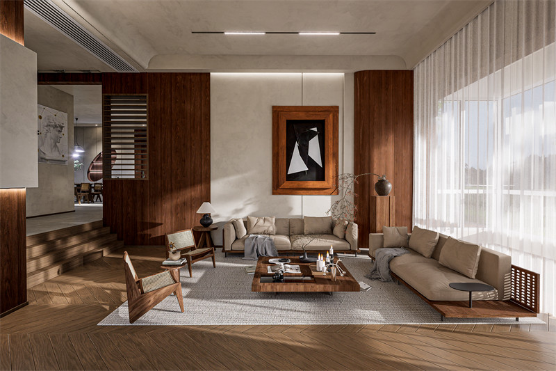 材质的选择是诧寂风的核心之一。在别墅设计中,优先使用天然、未经修饰的材料,如木材、石材、麻布等,以保留其原始的纹理和色调。木材可以选择有自然纹理的原木,保持其粗糙感,木材表面的瑕疵和岁月留下的痕迹,正是诧寂美学中的“缺陷美”。石材可以选用未经抛光的自然石块,表面带有些许凹凸不平,体现自然的肌理之美。地面材料可选用灰泥、混凝土等,呈现温润和朴实的质感。