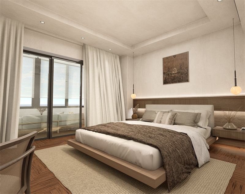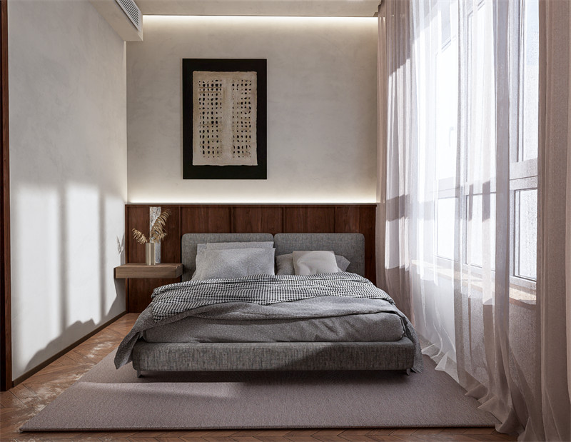 诧寂风的色彩以低饱和度的中性色为主,如浅灰、米白、沙土色等,以凸显材质的自然色泽。这样的配色方案不会过于抢眼或鲜艳,能够更好地融入自然光影的变化,创造出安宁的氛围。墙面和地板的色调保持一致,可以加重整体的连贯性,而家具、软装的颜色也以灰、米、棕为主,整体显得沉稳、和谐。