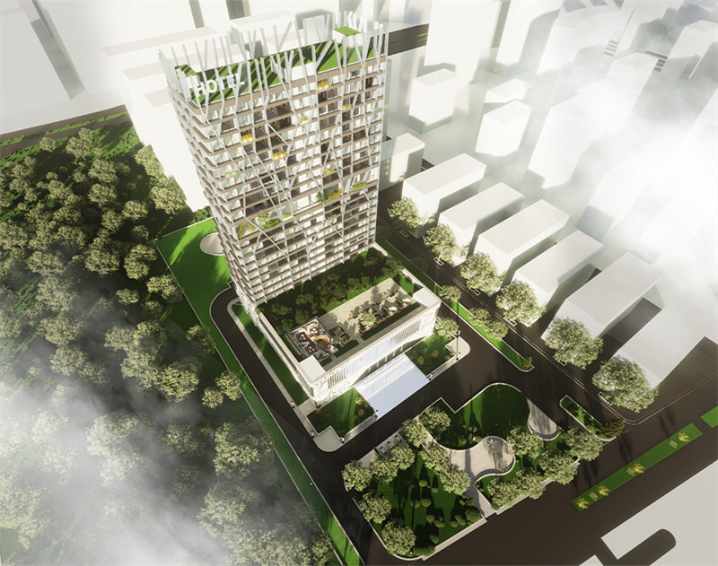 生态景观设计:在酒店顶层和露台设计露天花园,种植绿色植物,实现屋顶隔热和空气净化的效果。在单体设计中采用空中花园设计,设置竖向绿化,调节酒店内部微气候。