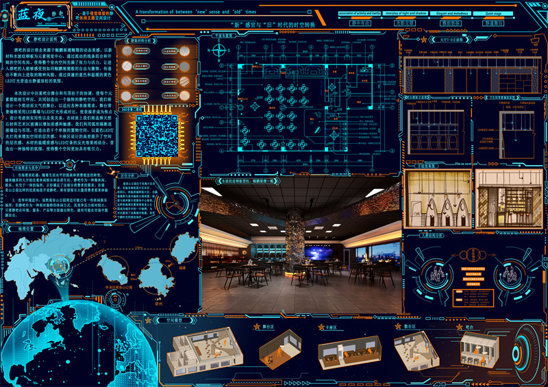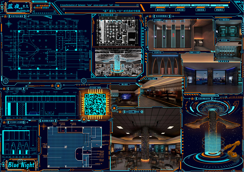 综上所述,《鲲鹏展翅·蓝夜静吧》设计作品不仅体现了对传统文化的传承与创新,还充分考虑了现代酒吧的运营需求与市场需求。在设计过程中,我们特别注重细节的打磨与整体氛围的营造。通过精心设计的空间布局、材质选择与色彩搭配,我们致力于打造出一个既具有文化底蕴又不失现代感的静吧空间。我们希望这个具有文化底蕴同时又充满创新与科技感的现代酒吧,能为城市的夜生活增添了一抹独特的风景。