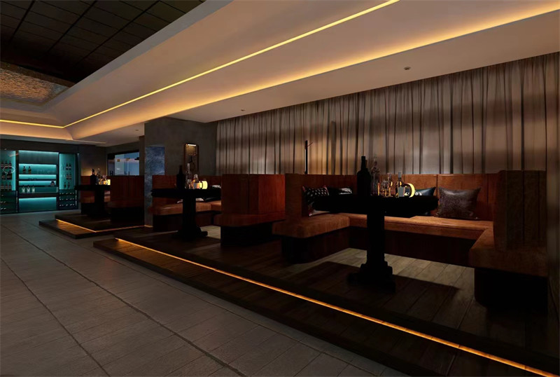 卡座区的设计是另一大亮点。通过高差的处理,我们提升了空间的层次感与私密性。木材的温暖质感与LED灯条的反光效果相结合,营造出一种温馨而又不失现代感的氛围,使得整个空间更加具有吸引力与亲和力。