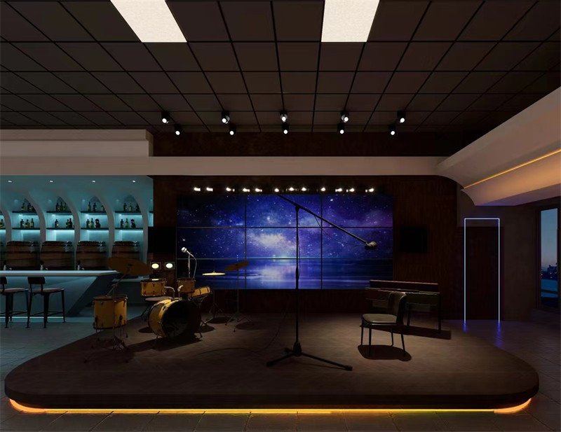 设计过程中,特别注重吧台舞台与吊顶柱子的协调统一。吧台作为酒吧的核心区域,其设计简洁而大气,既满足了日常运营的需求,又能够成为空间中的一处亮点。舞台设计则考虑了多种表演形式的需求,背景墙采用LED幕墙与LED灯光形成鲜明対比,确保表演者成为焦点。