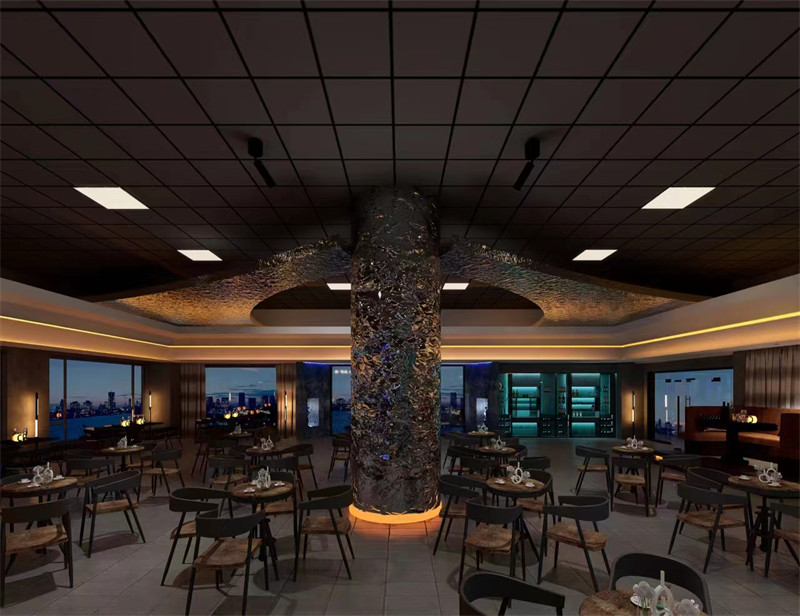 《鲲鹏展翅•蓝夜静吧》的设计理念源自中国古代神话中的鲲鹏展翅翱翔的动态美感。鲲鹏,作为中国传统文化中的神鸟,象征着自由、激情与不断向上进取的精神。设计中,我们尝试将这种精神风貌融入现代静吧空间,通过新材料水波纹钢板作为视觉中心元素,结合流动的线条组合与开阔的空间布局,营造出一种充满张力与活力的氛围。