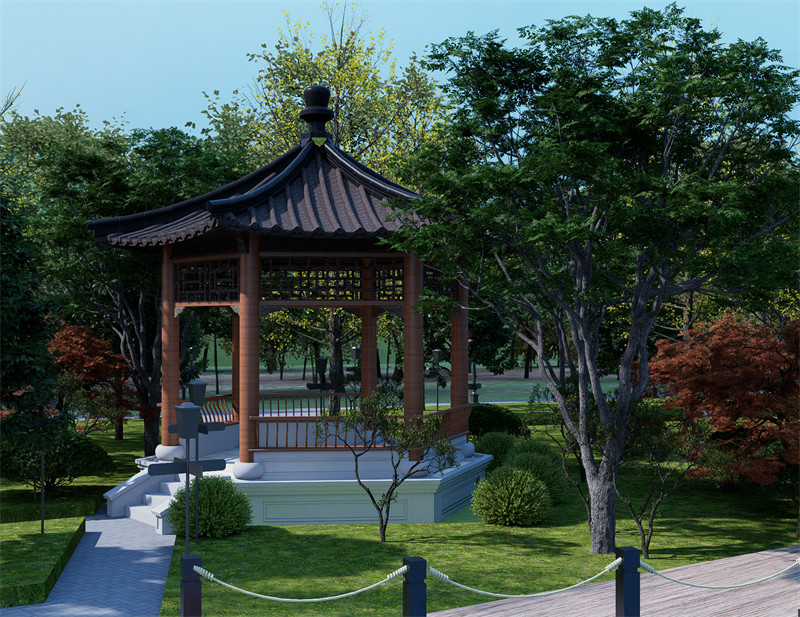 (5)中心小亭:位于整个公园的中心区,以便人们驻足停留休息