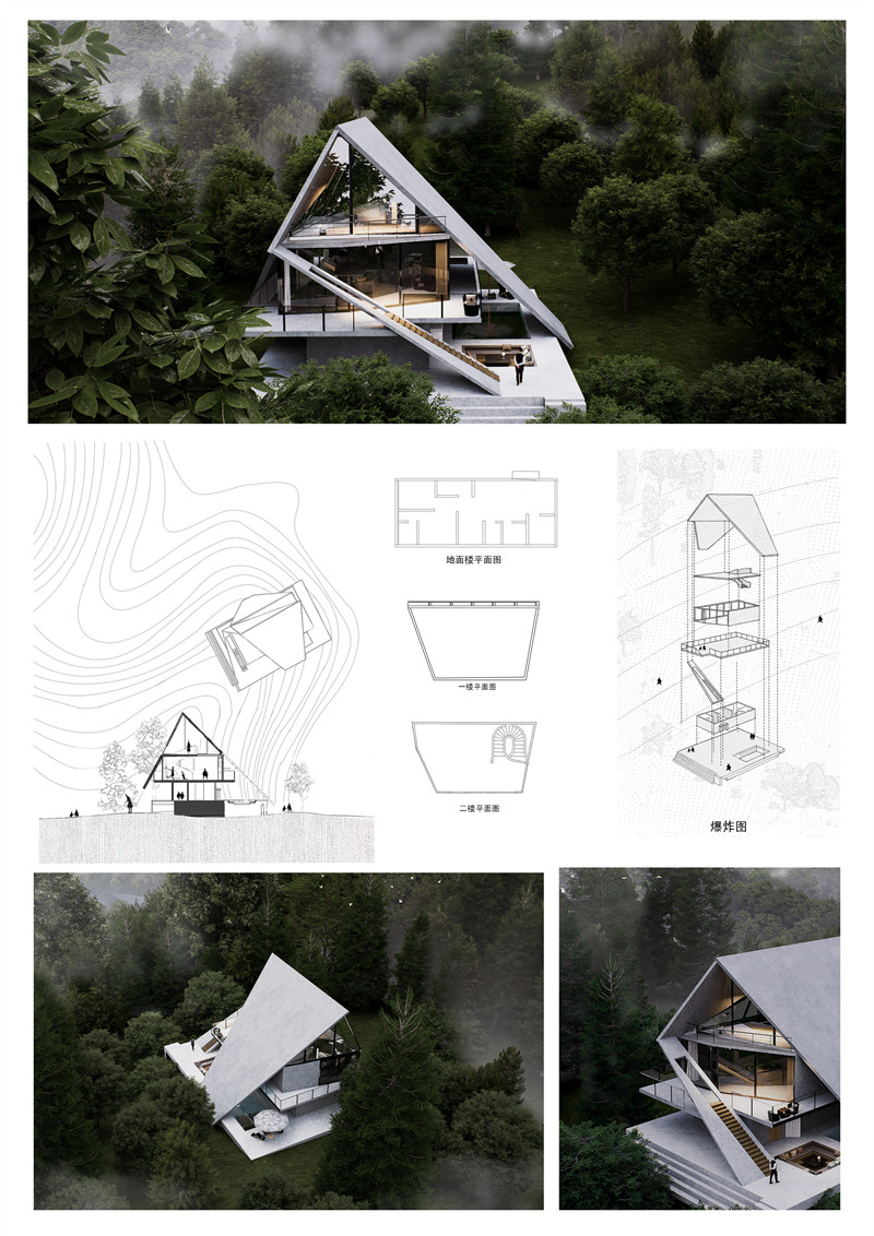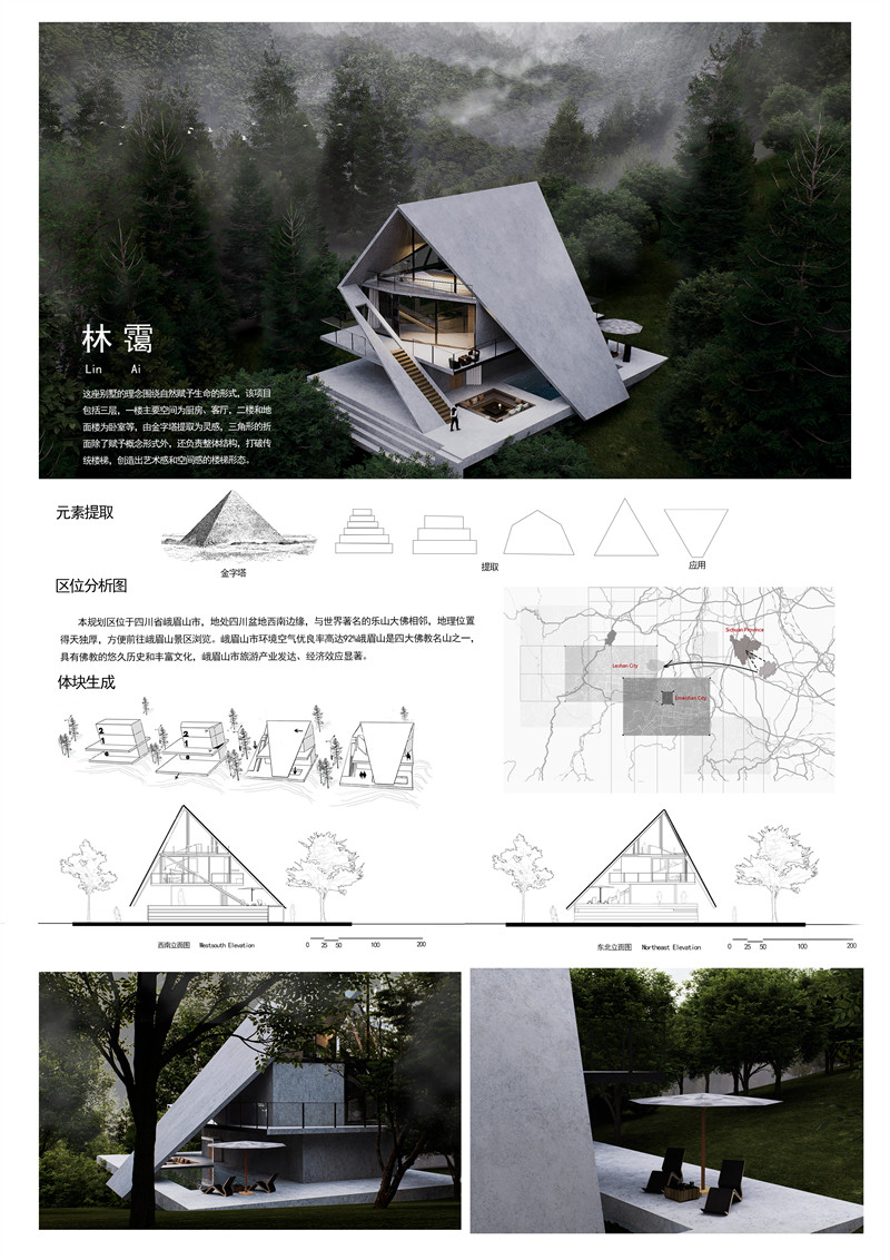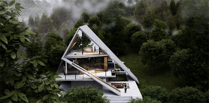 建筑坐落在茂密的森林中,周围被高大的树木和绿色植被包围,体现对自然环境的尊重和利用。能提供良好的自然景观,让居住者感受到与大自然的亲密接触。建筑的外观用简洁方式来体现,采用大量的几何形状,尤其是三角形的屋顶设计,与周围的树木形成和谐的对比。建筑材料采用混凝土和玻璃,这些材料不仅耐用,而且能很好地与自然环境融合。将混凝土的冷色调与周围的绿色植形成鲜明的对比,玻璃则增加建筑的通透感。建筑采用了分层设计,不同楼层有不同的功能。建筑设有多个户外空间,如阳台、露台和泳池区,这样的空间不仅增加了建筑的功能性,还能让居住者更好地享受自然环境。建筑的大面积玻璃窗和开放式设计,让居住者可以充分享受周围的自然景观。这种设计增加了建筑的通透感和开放性。