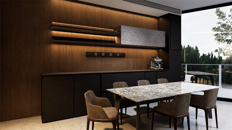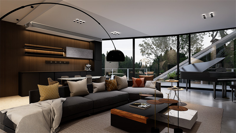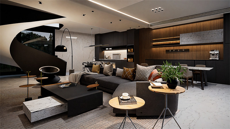这座别墅的理念围绕自然赋予生命的形式,考虑到人处在繁忙嘈杂的群居工作生活中,希望人们在回归自然的休憩生活,以金字塔为元素进行提炼变形做了一个三角形的折面,打破传统楼梯,创造出富有艺术感的形态。