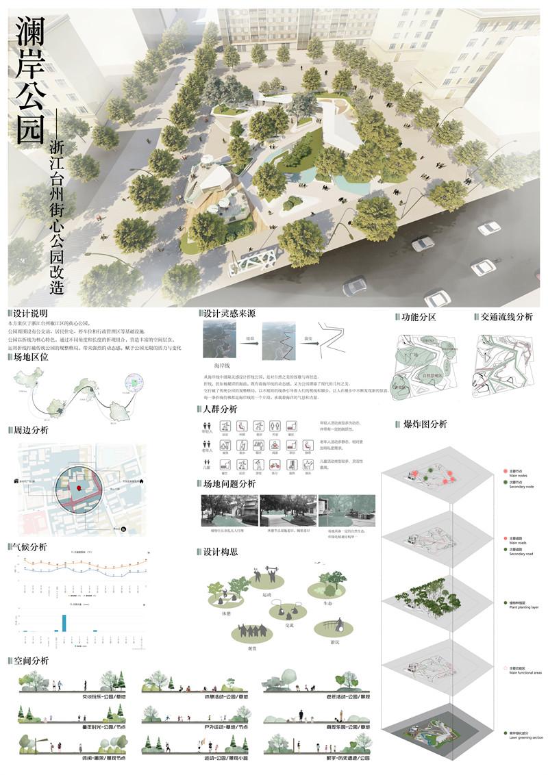 5.场地分析:该街心公园位于台州市椒江区的核心区域或特定街区之中。其周边环绕着多种不同功能的城市元素。一方面,紧邻着交通干道,具有较高的交通可达性,方便周边居民以及过往行人抵达,但同时也可能面临交通噪音和尾气污染的问题。周边有商业街区,人流密集,商业氛围浓厚,这为公园带来了潜在的大量使用者,并且在功能上可以与商业互补,例如为购物者提供休憩场所。此外,周边还分布有居民区,这决定了公园的主要服务对象之一是周边居民,其设计需要满足居民日常休闲、健身、社交等需求,且应考虑不同年龄段居民的活动偏好。