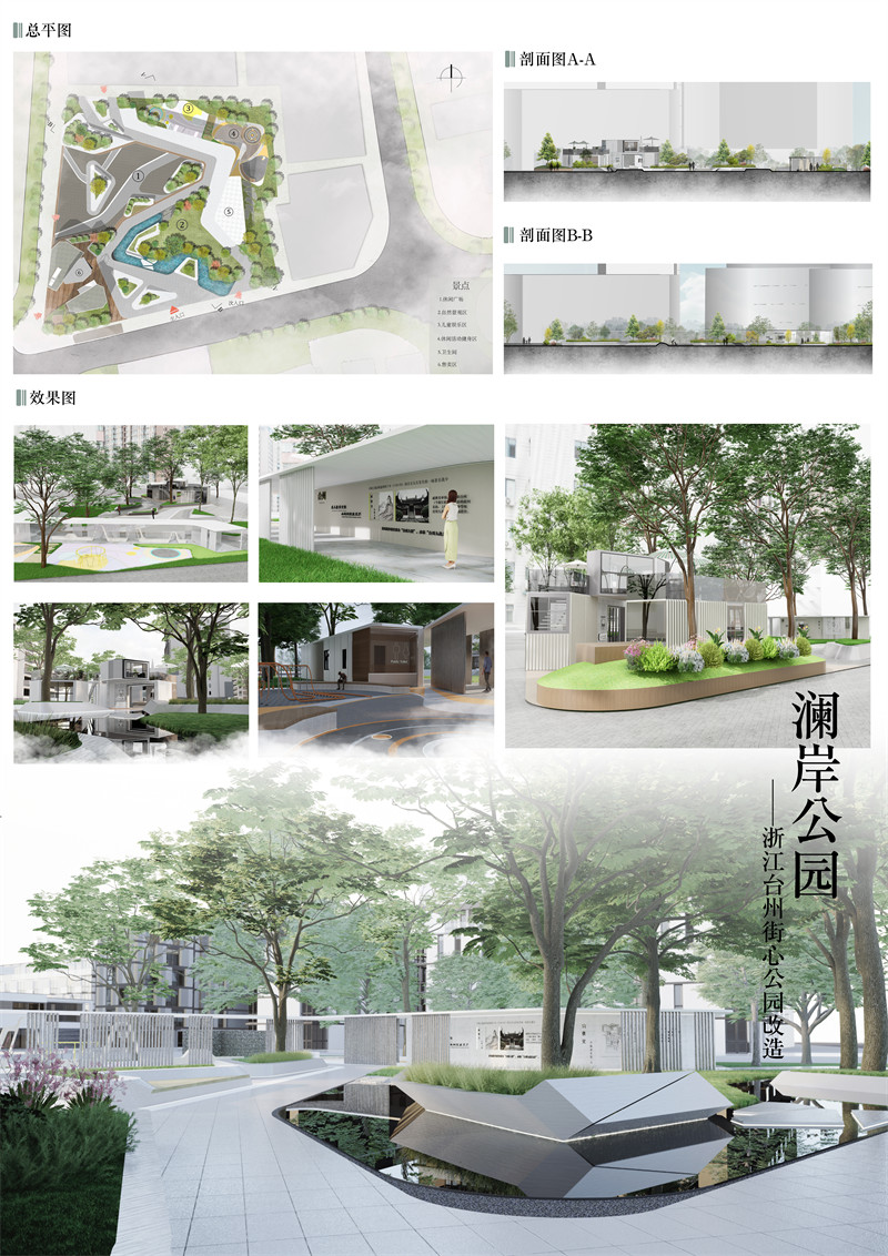 3.设计理念及思路:理念:通过简洁的设计元素、纯净的空间形式以及精心的材质选择来传达一种高级的审美感受。在公园设计中,摒弃过多繁琐的装饰与复杂的造型,以简洁流畅的折线线条作为主要的设计语言。这些折线元素贯穿于公园的道路系统、景观小品、地形塑造以及植物配置之中,形成统一而富有变化的整体视觉效果。思路及灵感来源:从台州市海岸线中汲取灵感设计,折线,犹如被凝固的海浪,既有着海岸线的动态感,又为公园增添了现代的几何之美。它打破了传统公园的规整格局,以不规则的线条引导人们的视线和脚步。