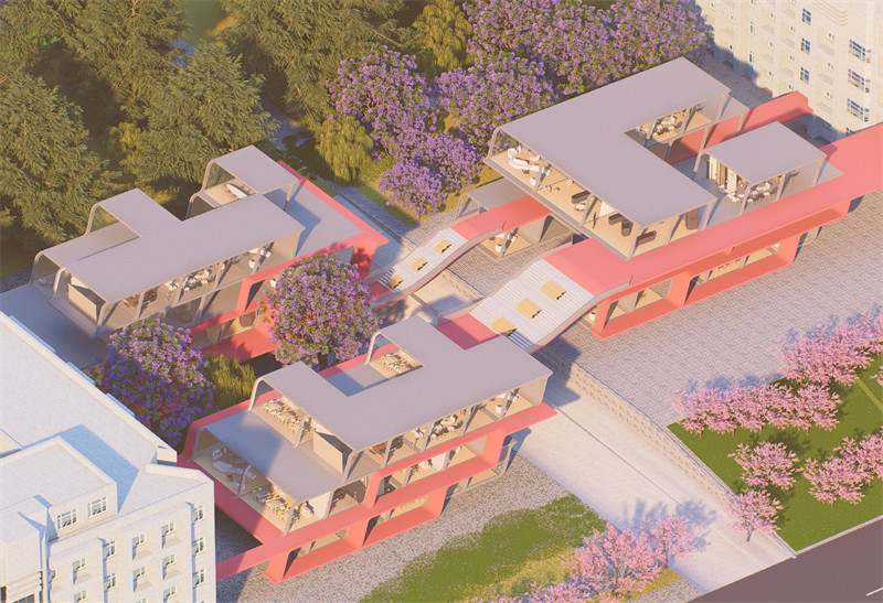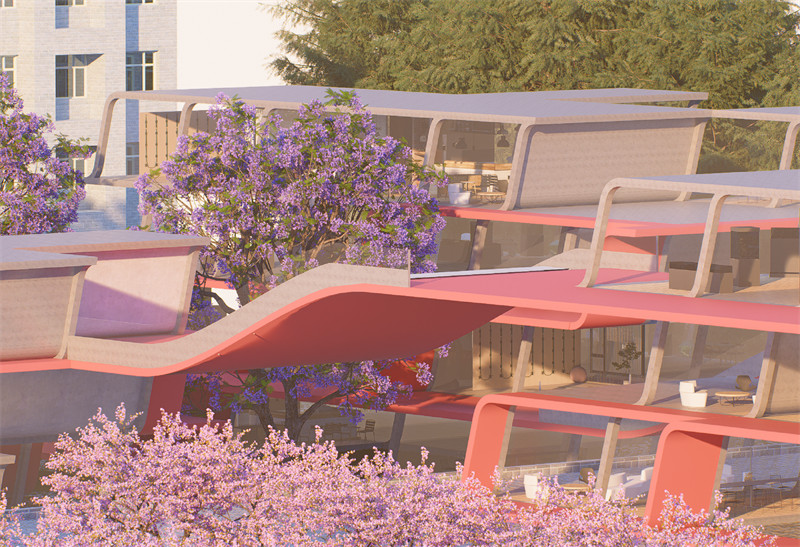 空间连通性:在宿舍楼之间的空地上,我们设计了一系列连廊、步道和小广场,将这些功能区域紧密连接在一起。此外我们也建立了活动空间和学生宿舍楼之间的联系,拓宽丰富了学生在宿舍的活动空间。这种设计不仅提高了空间的利用率,还方便了学生们的快速穿梭和互动,促进了宿舍楼之间的交流与融合。