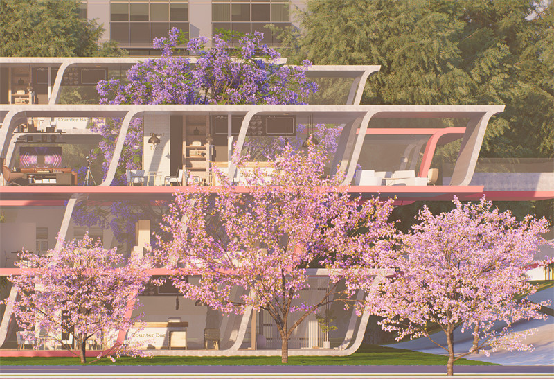 “绿创学苑”寓意着绿色、创新与学术的结合。设计旨在通过引入多元化的功能空间,打破传统大学宿舍楼周边的单一功能格局,激发学生的创新思维和社交活力,打造一个集学习、休闲、交流于一体的绿色生态空间。“绿”代表了对可持续发展原则的关注,利用自然光照、通风和绿色空间;“创”强调了创新和适应未来教育模式的能力;“学苑”表达了这是一个专注于学习的地方;而“多元互动”则突出了多功能空间、灵活的空间布局以及促进学生之间交流互动的设计目标。