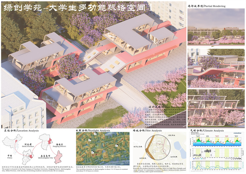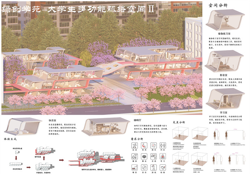 综上所述,“绿创学苑”的设计旨在通过功能多元化、空间连通性、绿色生态和智能科技等方面的创新实践,打造一个符合现代大学生需求的多功能宿舍周边空间。通过这一设计,我们期望能够激发学生的创新思维和社交活力,为燕山大学东校区增添一道亮丽的风景线。