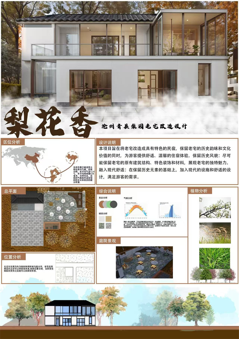 此次改造更融合河北的文化历史和精髓,此次改造在结构上尽量保留老宅的主体构造,如木梁、石柱等,展现老宅的历史沧桑感,对老宅的门窗,砖瓦等传统元素进行修复,使其重现昔日风采,布局上功能分区合理,明确餐厅、接待区、阅读区的公共区域和客房等私人区域。保证旅客的隐私性和便利性。采光与通风上在不破坏老宅的原有结构上,适当增加了窗户,提高室内采光和通风效果。材料选择上,选用传统材料,如青砖、石板等,与老宅风格相协调。还结合现代材料,使用玻璃、钢材等现代材料,既能延长老宅的寿命,还能增加老宅的时尚感和实用性。软装搭配上,现在家具为主,保留一些木质家具,营造浓厚的历史氛围,添加一些绿色植物,为老宅增添活力与生机。