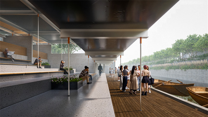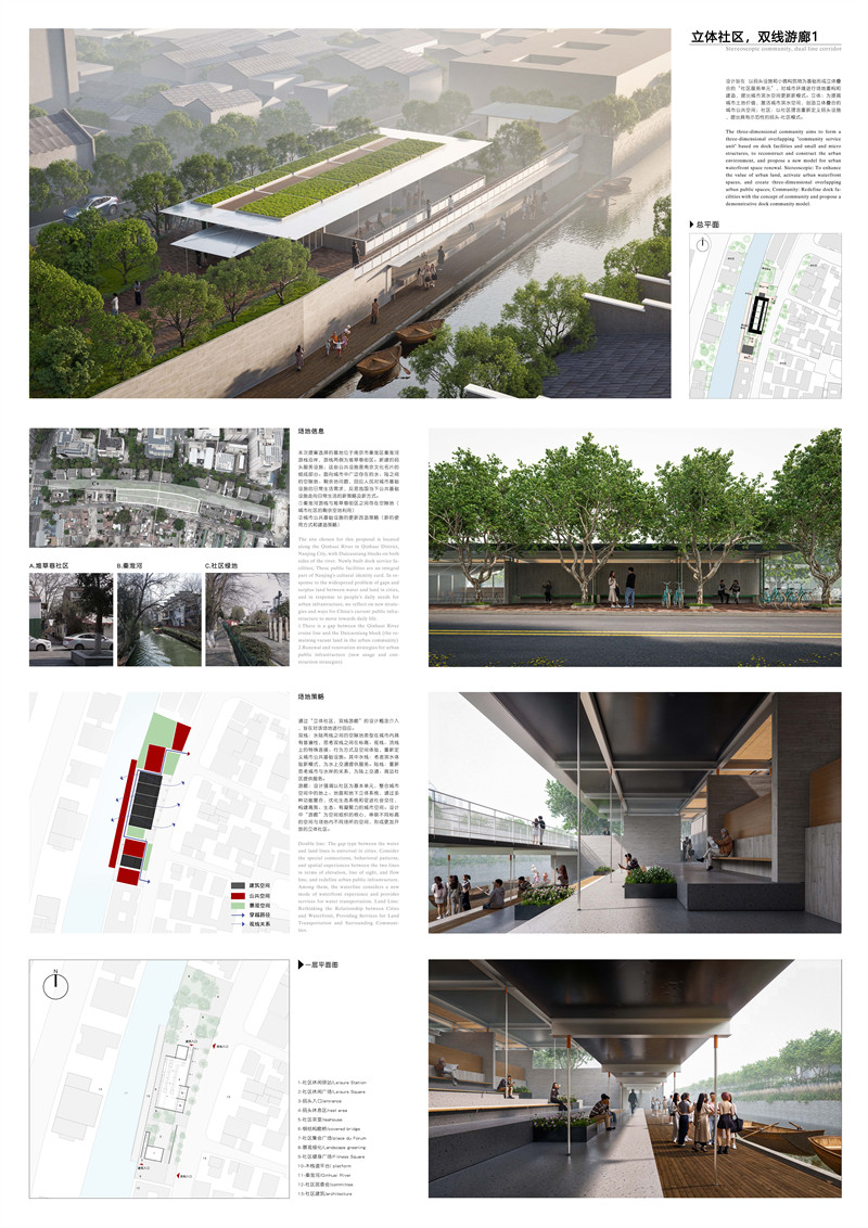 通过“双线码头,立体游廊”的设计概念介入,旨在对该场地进行回应。双线:水陆两线之间的空隙地类型在城市内具有普遍性,思考双线之间在标高、视线、流线上的特殊连接、行为方式及空间体验,重新定义城市公共基础设施。其中水线:考虑滨水体验新模式,为水上交通提供服务。陆线:重新思考城市与水岸的关系,为陆上交通、周边社区提供服务。游廊:景观都市主义中“立体环境-社区单元”的理念强调以社区为基本单元,整合城市空间中的地上、地面和地下立体系统,通过多种功能复合,优化生态系统和促进社会交往,构建高效、生态、有凝聚力的城市空间。该提案中“游廊”为空间组织的核心,串联不同标高的空间与场地内不同场所的空间,形成更加开放的立体社区。