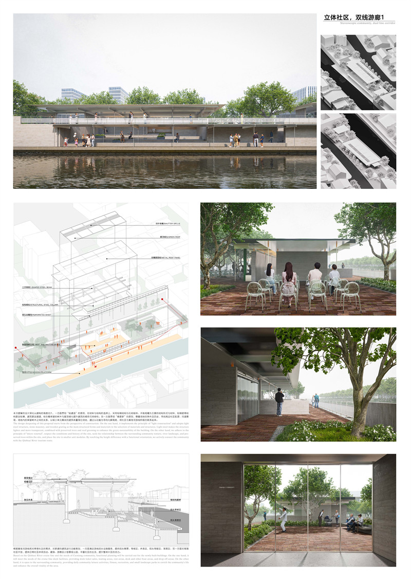 本次提案的设计深化从建构的角度切入,一方面贯彻“轻建造”的原则,在材料与结构的选择上,采用轻钢结构与石材砌体、木制格栅为主要的结构形式与材料,轻钢使得结构更加轻薄,建筑更加通透,结合着保留的树木与屋顶绿化提升建筑的绿色可持续性。另一方面贯彻“微更新”的原则,尊重场地的条件及历史,寻找周边社区肌理、河道景观、场地内的保留树木之间的关系,以较小单元模块的建筑体量落位场地,通过以功能为导向化解高差,将社区与秦淮河游线积极的联系起来。