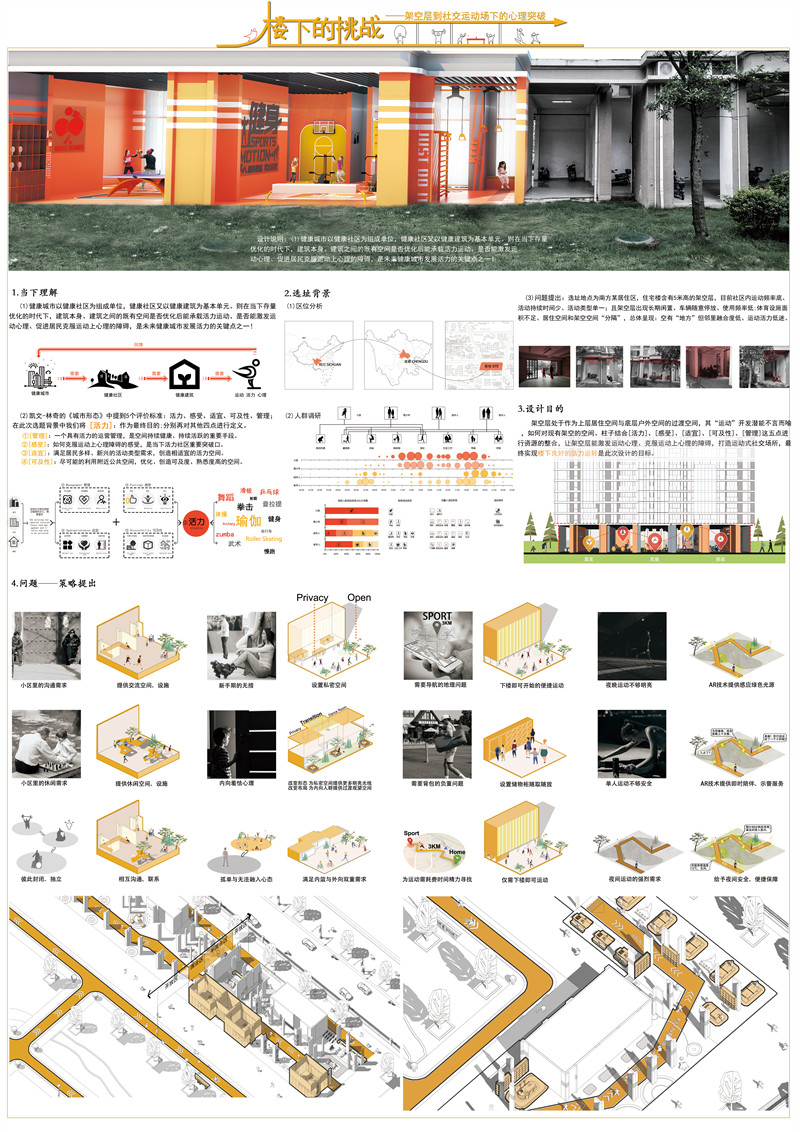 5.场地分析:选址定位于成都阳光苑小区,其住宅楼配备有 5 米高的架空层。现阶段,该社区存在一系列问题:居民运动频率较低,各项活动持续时长较短,且活动类型较为单一;架空层长期处于闲置状态,车辆肆意停放,致使其使用频率处于较低水平;此外,体育设施占地面积不足,居住空间与架空空间相互隔离,缺乏有效衔接与互动。总而言之,该社区虽具备一定的空间资源,但邻里之间的融合程度较低,运动活力显著不足,未能充分发挥空间应有的功能与价值,在社区活力营造与空间利用方面存在较大的提升空间。