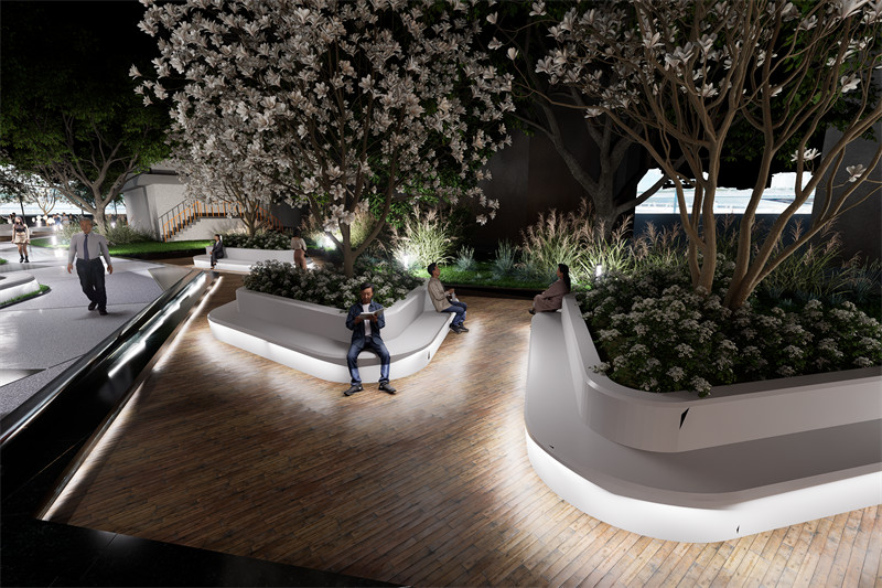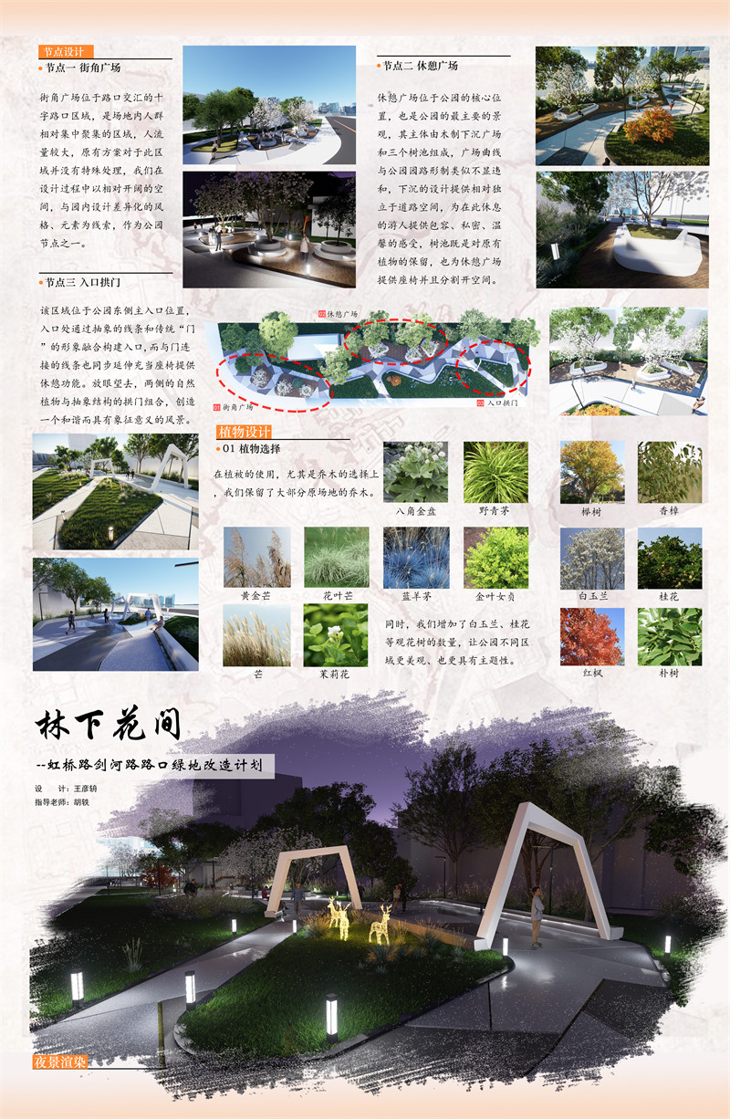 休憩广场位于公园的中心位置,也是公园的最主要的景观和活动场地,其主体由木制下沉广场和三个树池组成,广场曲线与公园园路形制类似不显违和,下沉的设计提供相对独立于道路空间,为在此休息的游人提供包容、私密、温馨的感受,树池既可以满足保留原有植物的要求,也为休憩广场提供座椅并且分割开空间。树种选择上以场地原有香樟、朴树、榉树等安放在广场外侧;树池中选择种植白玉兰。广场内花与叶交融,也契合林下花间的名称。