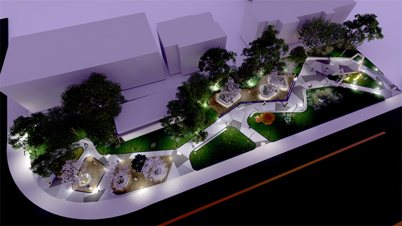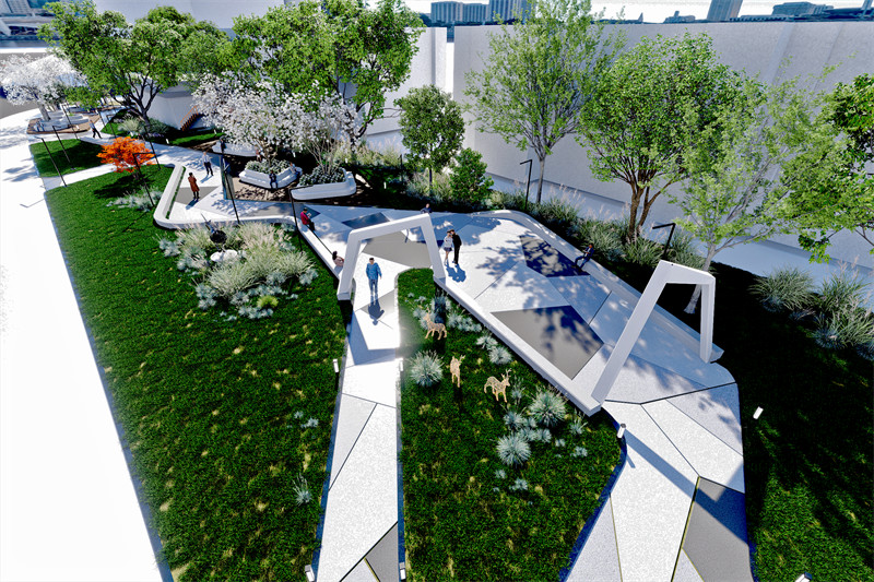在设计中需要扩大活动范围、加强连通性,总体上将场地与主路融合,强化公园与人行道的关系。内部对部分空间进行切割,形成相对独立、私密的休憩空间。