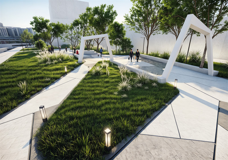 该区域位于公园东侧,是公园的主要出入口。在这里我们将抽象的线条与传统“门”的形象融合构建出口入口。同时,与门连接的线条也同步沿道路线条延伸,充当座椅提供休憩功能。放眼望去,两侧的自然植物与抽象结构的组合,创造一个和谐而具有象征意义的风景。