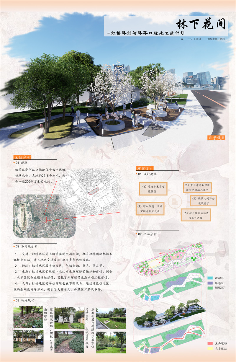 设计区域位于上海市长宁区,虹桥路剑河路路口绿地,该设计是针对此区域内口袋公园的更新改造方案,旨在提升改善城市生态环境、为周边居民创造宁静、美观的休憩环境与日常交往和社会活动的公共空间。