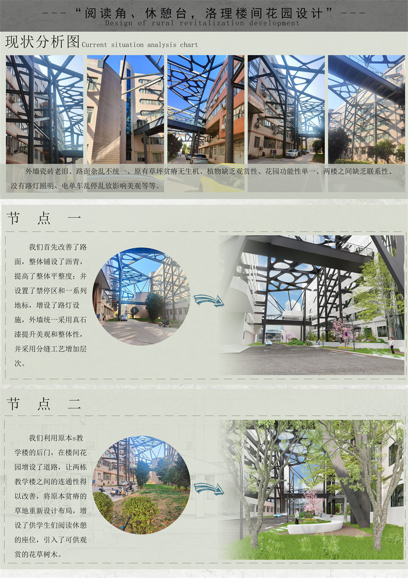 为解决本校两教学楼之间的割裂性、美观性、功能性,本案设计的重点是改善了两楼间的花园设计。首先将现有的场地进行分析,利用原教学楼后门,设计道路,合理的动线布局,这一举措旨在加强两楼间的联系性。