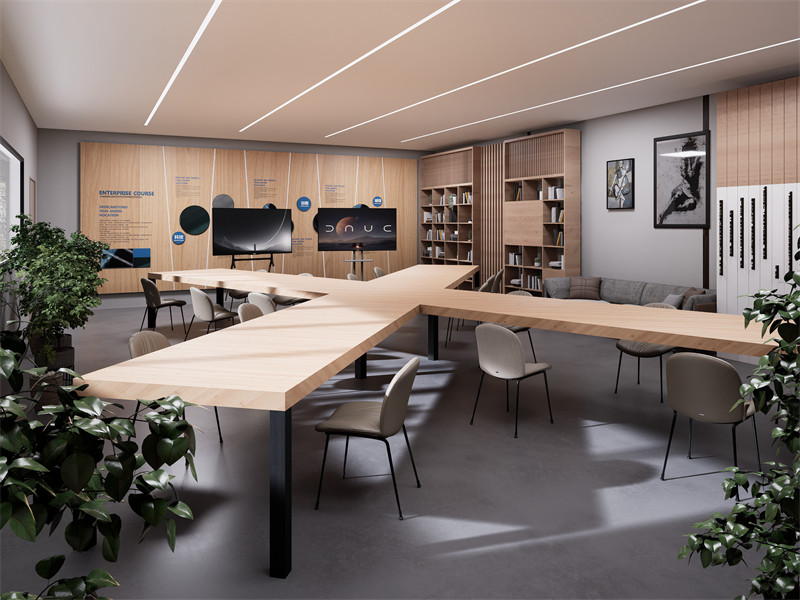 色彩搭配分区:我们在不同的空间上采取了不同的主色调,餐饮空间我们主要以原木色为主色调,营造出一种温馨、自然的氛围,让人更加放松和舒适。在学习空间,我们主要以黄色为主色调,黄色能够吸引眼球,有助于提高注意力和集中力,这对于学习环境来说是有益的。同时黄色可能有助于提高记忆力,尤其是在需要记忆和回忆信息的学习环境中。而在休闲洽淡空间我们以蓝色为主色调,可以帮助减轻压力和焦虑,鼓励开放的对话,在团队会议或协作空间中使用蓝色,可以促进成员之间的交流。