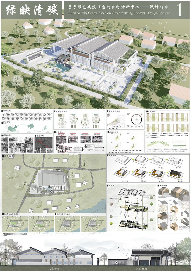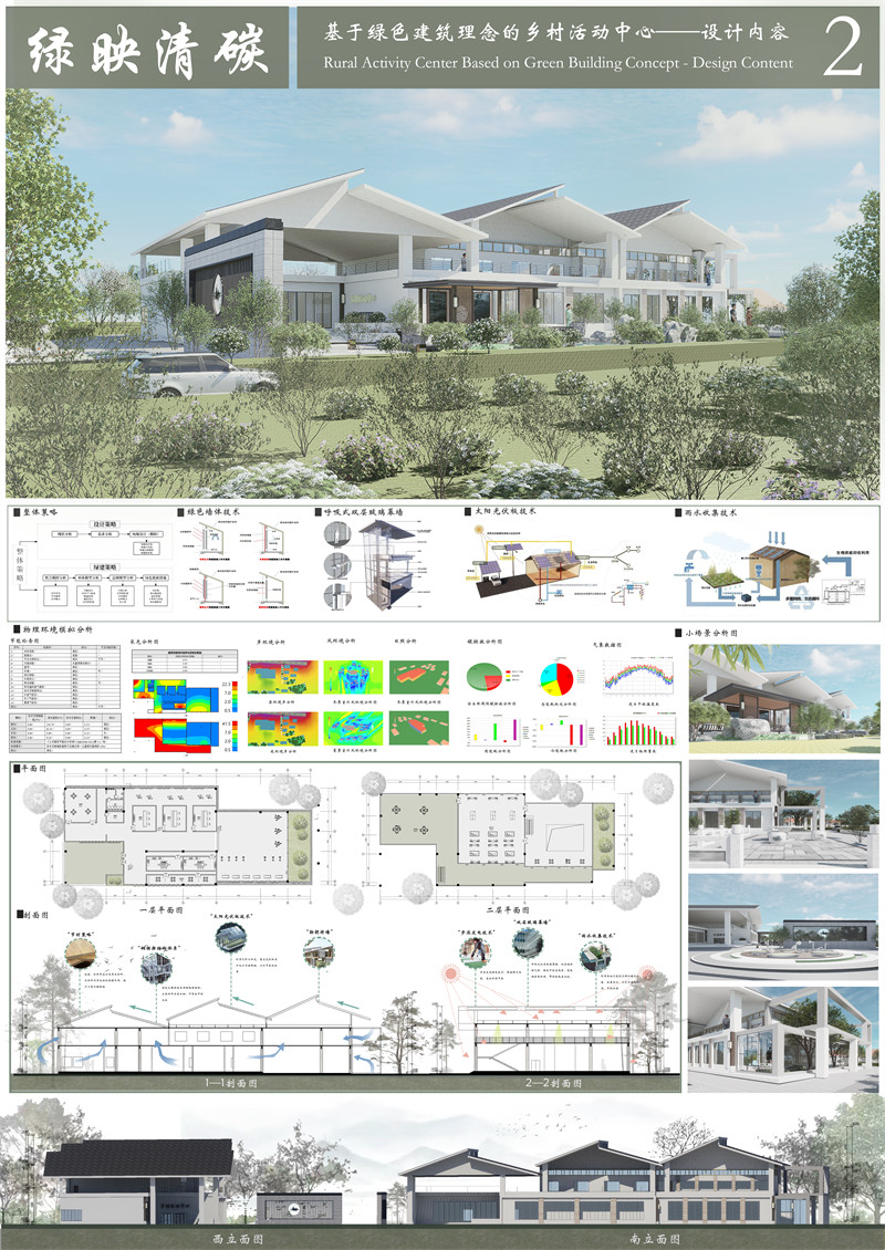 2.作品名:绿映清碳 – 基于绿色建筑理念的乡村活动中心