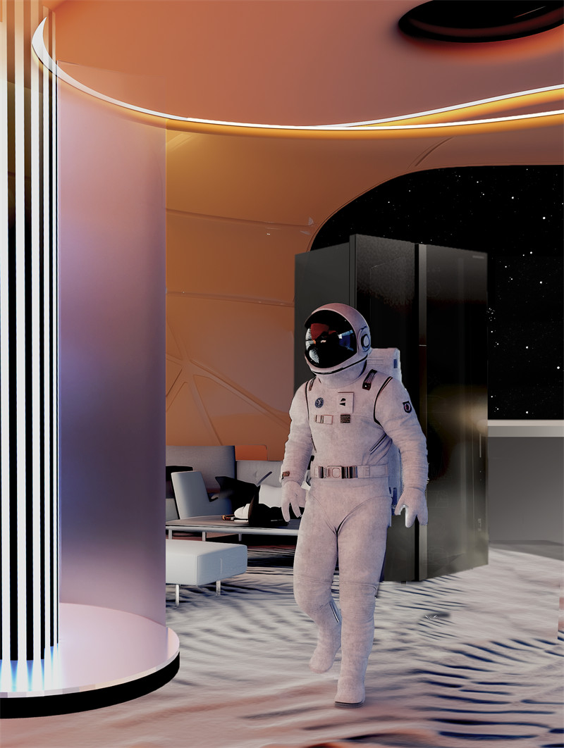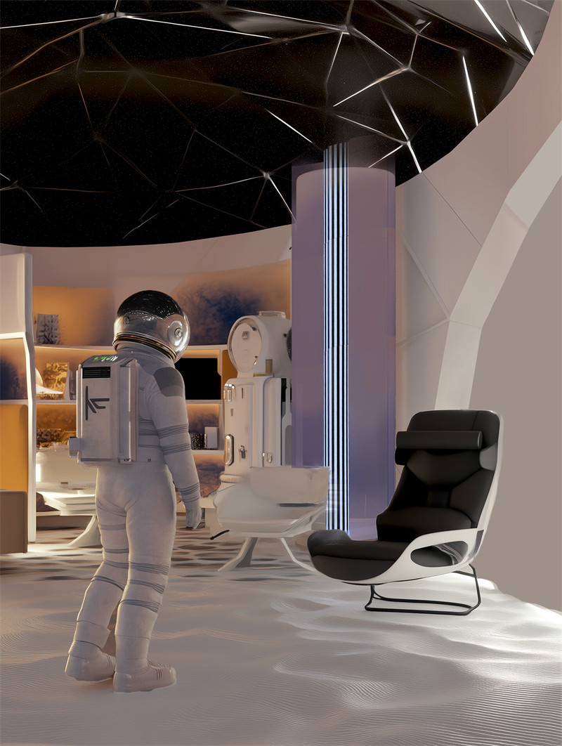 休闲活动模块:内部提供健身、娱乐、放松功能区。采用动态光影投射技术和可调节环境控制系统,模拟地球自然景观,缓解长期任务中的心理压力。