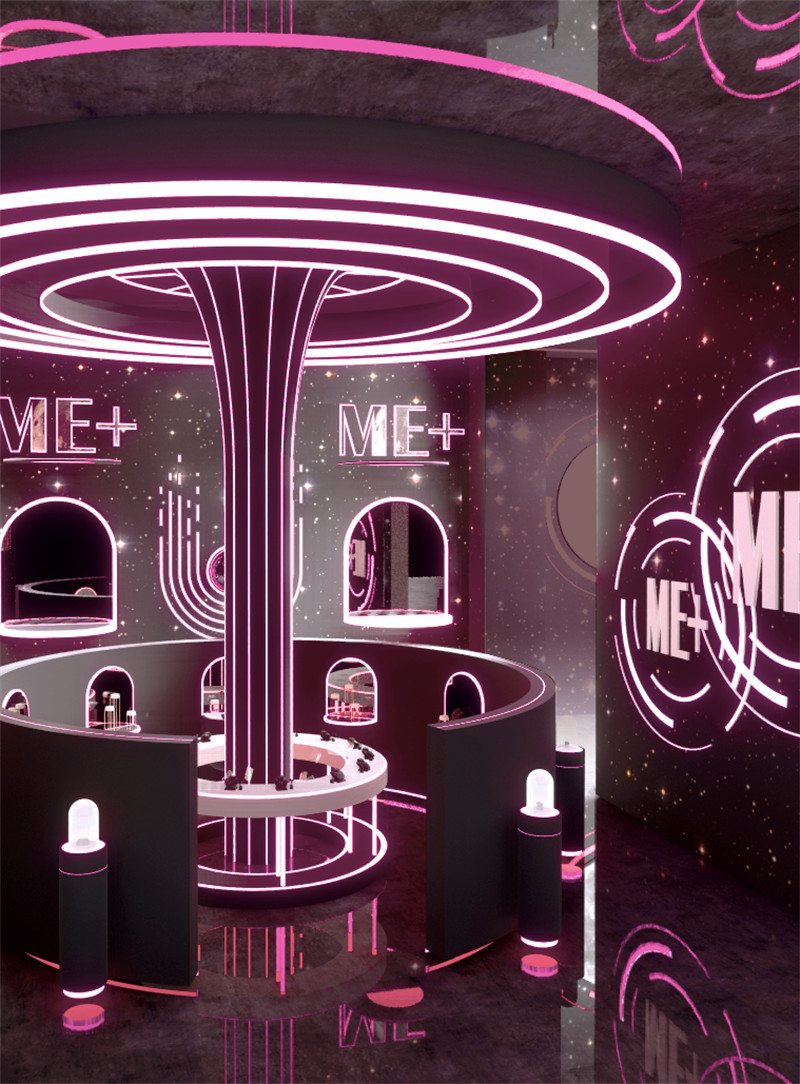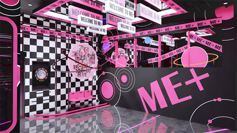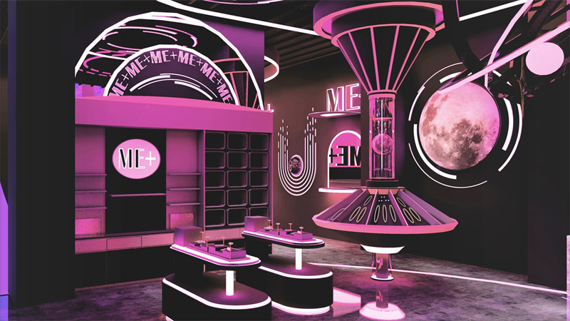 色彩分析:我们提取ME+的印象色玫粉色为主题色,玫粉色饱和度高,在视觉上本来就很吸引眼球,因此我们放弃明亮的白色,选用低调的黑色为背景色,能更好地突出玫粉色。黑粉的效果更加时尚,黑色基调的商业空间也更加新颖吸引眼球,黑色的背景贴合了宇宙空间感,也使饰品更加突出,起到了更好的陈设作用。为了缓解玫粉色带来的视觉疲劳,我们还选择了浅天蓝,紫色,拿坡里黄等偏冷的颜色,来中和空间,更起到点缀作用。