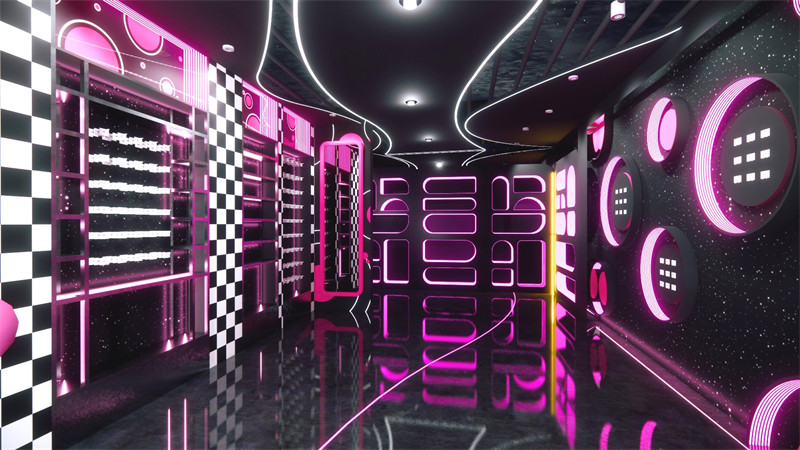 灯光分析:比起大灯我们更偏向用点光源来营造氛围,降低整体空间的亮度,在陈设部位重点加强灯光,有主有次,突出商品。我们多采用霓虹灯,玫粉色居多来呼应主题,其次是浅天蓝和明黄色来中和。
