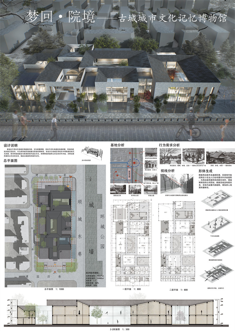 一个地方的特色民居是城市居民记忆的容器,当地居民曾经生活过的居住建筑样式往往能直接唤醒他们对于这个地方最深处的时光记忆。基地场地狭长,周边建筑缺乏文化特色,而当地传统民居——关中窄院恰好符合场地要求,能够在狭长的土地上组织流线功能,同时建筑特色符合场地文脉。因此我以关中窄院作为我的设计意象,研究并提炼其剖面、平面布局、院落构成特点,作为我的设计参考与依据,打造出一个符合场地文化调性的文化博物馆。 新时代的博物馆不仅需要文化展览职能,还应承担一部分城市公共空间职能。在进行场地调研时,我发现场地西侧是大量居民区,居民们自发在狭窄的街巷上摆摊售卖二手物品,社区富有活力,但经常会受到城管的管制,活力受到遏制。而不远处的广场公共空间面积狭小,附近居民缺乏舒适的公共空间开展休憩、交流、二手物品交易活动。 因此,我通过主要的道路出入口及人流方向确定了几个节点作为对外开放的园林空间,供附近居民休憩交流,此为开放式园林空间。结合场地功能流线及平面布局,综合布置其余院落。部分院落虽然临街但通过架空、设置水景等方式与公众拉开距离,使得公众不可进入,确保建筑内部使用不被干扰的同时,外部游客可以窥到院落的景色,内部参观者可以向外眺望城墙,建筑内外通过庭院形成视线上的交流互动,形成了半开放的园林空间。园林与城墙互相借景,丰富城市公众与参观者的建筑体验。同时结合总体布局,在场地内设计了完全供内部参观者使用的园林,此为私密的园林空间。