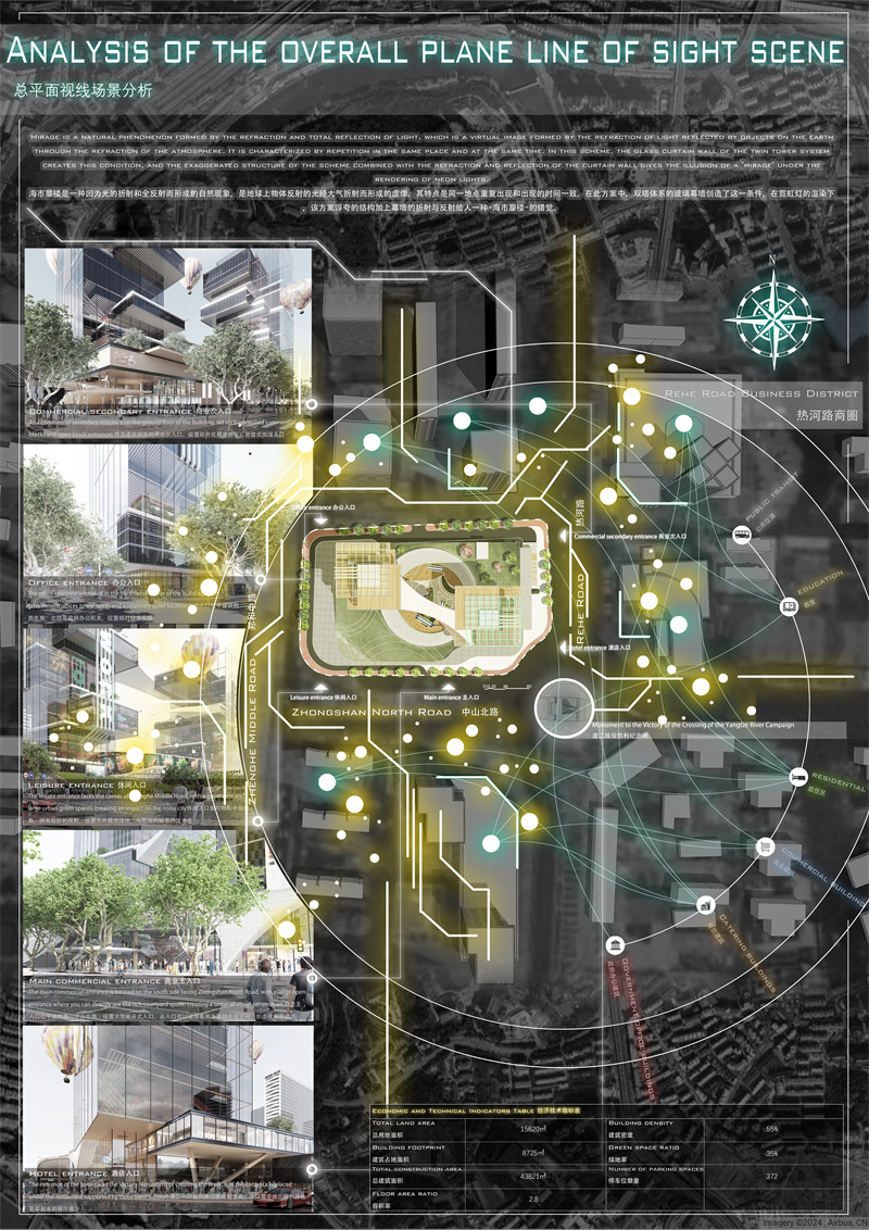 基于城市视角下TOD模式的高层综合体设计,本次设计作为一个高层综合体设计,我们主要从阅江楼-江心洲相连所产生视线通廊作为设计出发点,并设计层层挑台以为使用建筑的人们提供更多良好的景观空间。通过连廊,层层挑台等布置可以看到江心洲的景色,双弧线的连廊设置起到一个框景的作用,连接江心洲与阅江楼,形成通透的视线。海市蜃楼是一种因为光的折射和全反射而形成的自然现象,是地球上物体反射的光经大气折射而形成的虚像。其特点是同一地点重复出现和出现的时间一致,在此方案中,双塔体系的玻璃幕墙创造了这一条件,在霓虹灯的渲染下,该方案浮夸的结构加上幕墙的折射与反射给人一种“海市蜃楼”的错觉。