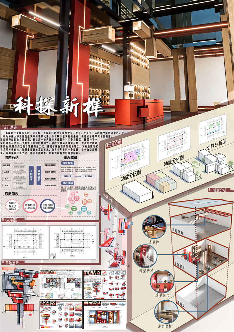该青少年活动中心将集休闲、娱乐、学习、实践与创新于一体,旨在打造一个青少年及各类社会人士交流思想、放松身心、接受文化熏陶、培养爱国情怀的重要平台。活动中心以中国传统元素榫卯为主要设计元素,利用斗拱的穿插分割,将空间划分多个区域。空间可以满足举办各类技能提升课程、创新思维训练、实践操作项目等需求,激发青少年的学习兴趣和创新潜能,培养青少年的爱国情怀和文化素养。结合当地老旧房改造项目,青少年活动中心的建设将注重以下方面。一是文化传承,在改造过程中,注重保护当地的历史文化遗产和建筑风格,将传统元素融入青少年活动中心的设计中。二是功能优化,对老旧房屋进行功能优化和升级,使其满足现代生活和学习需求。三是绿色节能,采用新型环保材料和技术进行改造,提高建筑的保温、隔热性能,降低能耗。同时,增加绿化设施,提升居住环境质量。四是社区融合,青少年活动中心的建设将注重与周边社区的融合与互动,促进社区文化交流和居民之间的互助合作。