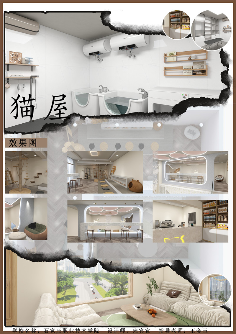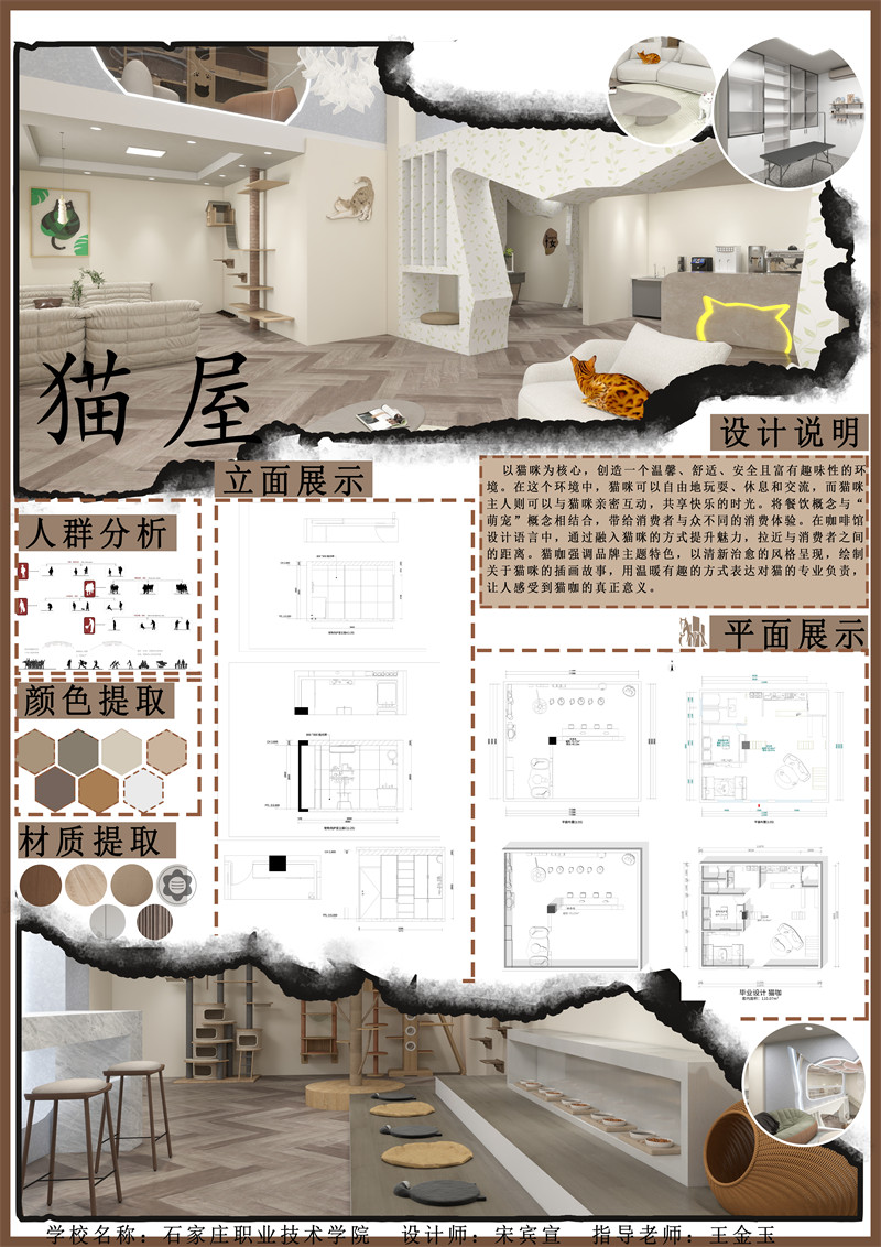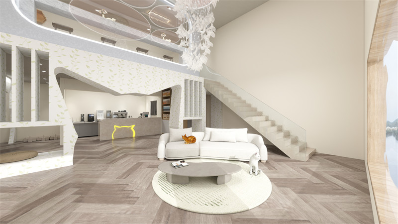 在色彩选择上,我们运用自然的色调,如棕色、米色等,营造出温暖而宁静的氛围 。这些颜色对于猫咪来说也比较适宜,不会给它们的视觉带来强烈刺激。米色的墙壁能够反射柔和的光线,使整个空间看起来明亮而温暖,就像家的感觉一样,让顾客一进入猫咖就能感受到宁静与惬意。还有一些 挂画、摆件等,增添空间的艺术感。考虑到猫咪与自然的联系, 通过木质地板、木质猫爬架或木质装饰板来体现。木色给人一种质朴、自然的感觉,它与暖色调的墙面搭配相得益彰。绿色植物也是猫咖色彩和氛围营造的重要部分。绿色植物不仅能带来自然的色彩,还能净化空气。选择一些猫草等对猫咪无害的植物,它们的翠绿色为空间增添了生机与活力。良好的通风和充足的采光能让宠物空间保持干爽和清新。适当的窗户设计不仅能让阳光洒进来,还能让宠物欣赏外面的风景。