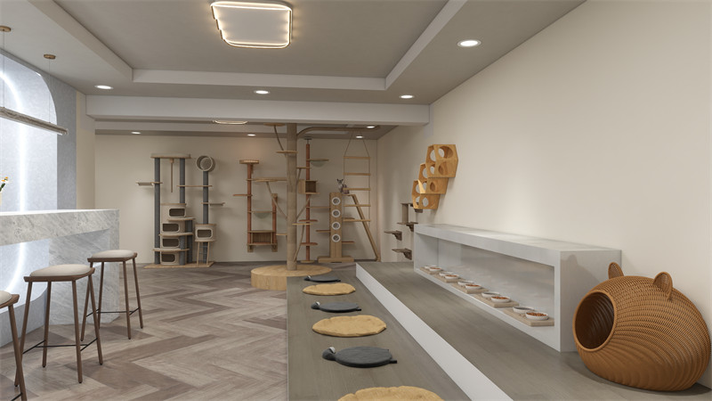 在布局上,我们有舒适的座位区,让顾客在品尝咖啡或甜点的同时,欣赏猫咪的优雅姿态。同时,有个专门的猫咪活动区,为猫咪提供足够的玩耍空间。这样既能满足顾客的观赏需求,又能保证猫咪的舒适度。我们选用无毒、无异味的环保材料。还要确保空间没有尖锐的边角,以防止宠物受伤。地面选择防滑的木质地板,避免宠物在奔跑时滑倒。休息区 设置一些猫窝、猫树等,猫窝的选择是多样化的,有开放式的、半封闭式的和封闭式的,以满足不同猫咪的喜好。猫树的设计考虑到高度,还要有足够的平台供猫咪休息和瞭望。玩耍区放置了一些猫玩具。球、逗猫棒等玩具,并且空间开阔,方便猫咪奔跑和追逐。猫砂盆区相对独立,保持通风良好,以减少异味,并且易于清洁。垂直空间的利用也非常重要。猫咪喜欢攀爬,所以有多层的架子、天桥等,将不同的区域连接起来,增加猫咪活动的趣味性和多样性。