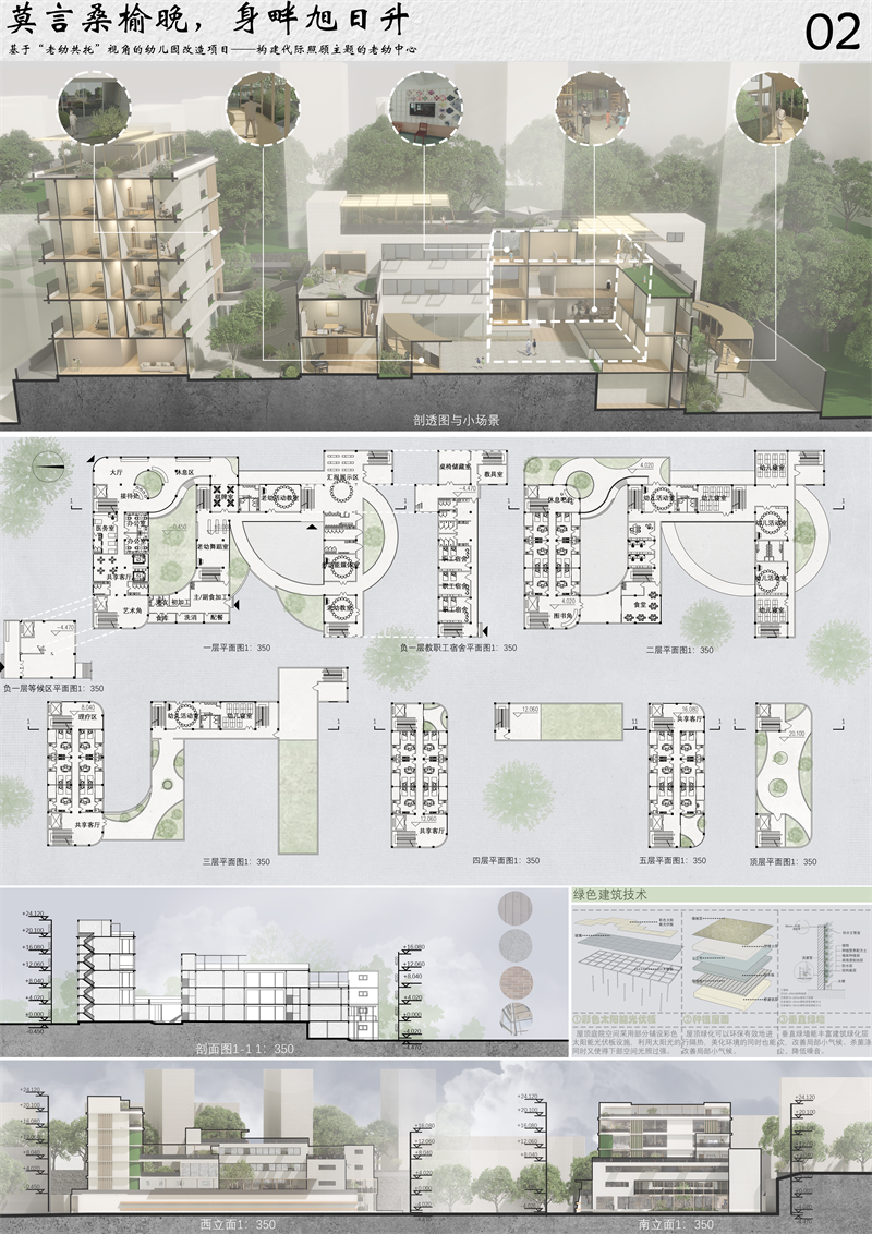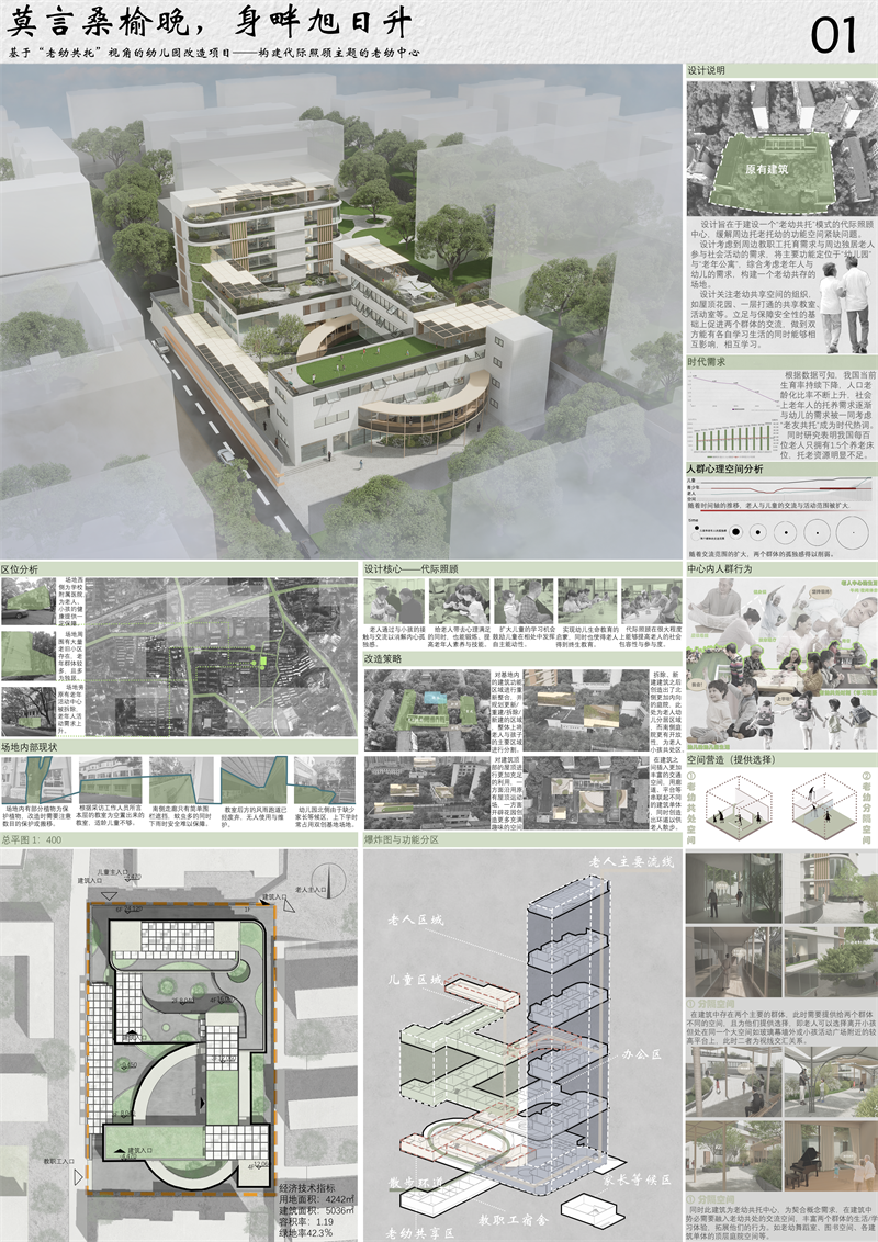 2.作品名:莫言桑榆晚,身畔旭日升 – 基于“老幼共托”视角的幼儿园改造项目 – 构建代际照顾主题的老幼中心。