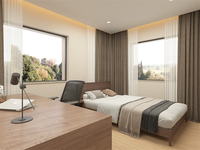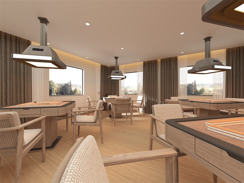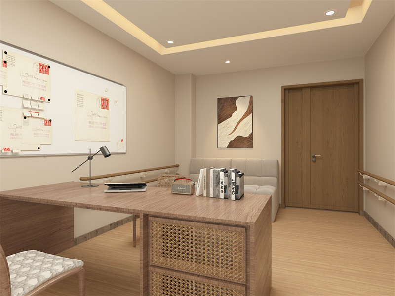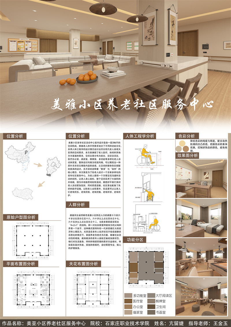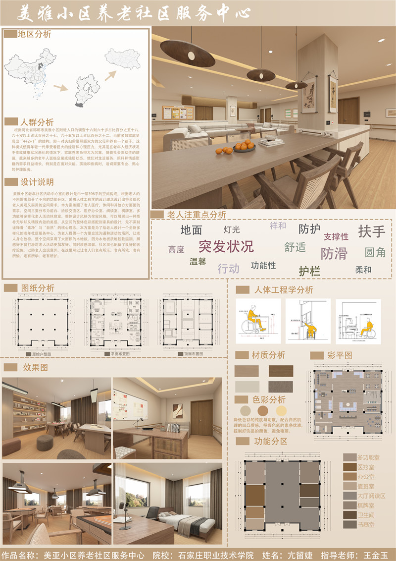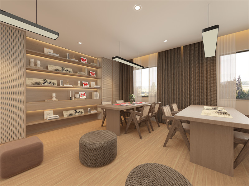 为目标人口做出设计:设计空间主要分布为前台、洽谈交流区、医疗办公室、阅读室、棋牌室、健身房等多样化老人活动休息室。整体设计风格为侘寂风格,可以展现出一种质朴无华却又精致内敛的美感。
