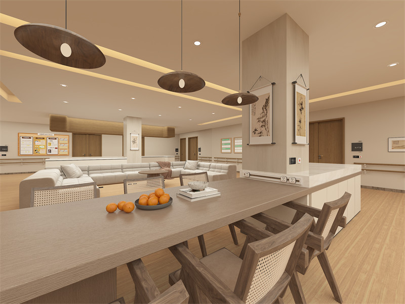 设计细节:空间设计了阅览室和书法室方便老人阅读交流和学习。还有多功能厅和棋牌室为老人提供休闲娱乐的空间。因为老人视觉感官能力下降,所以整个空间使用无主灯设计使室内照明充足且均匀,避免强光和阴影,色彩对比度柔和。因为老年人身体机能逐渐衰退,肌肉力量减弱,行动迟缓,平衡能力下降,容易摔倒,所以整个空间采用了大面积的木地板。木地板质地较软温润,脚感好的不易打滑同时质感温馨。空间布局减少不必要的障碍物便于老年人行动。室内通道宽度满足轮椅和助行器的通行要求,不会狭窄和拥挤。同时也在各空间墙面上设置了扶手防止老人摔倒。卫生间设置扶手、防滑地面和坐便器,方便老年人使用。为了老人身体健康在社区里也配备了良好的医疗设施,和紧急呼叫按钮,平时可以量血压或测血糖也可以体检。也可以连接到护理人员值班室,以便老年人在遇到紧急情况时能够及时得到救助以防老人出现意外。在这里可以让老人们老有所乐、老有所依、老有所愉、老有所学、老有所护。