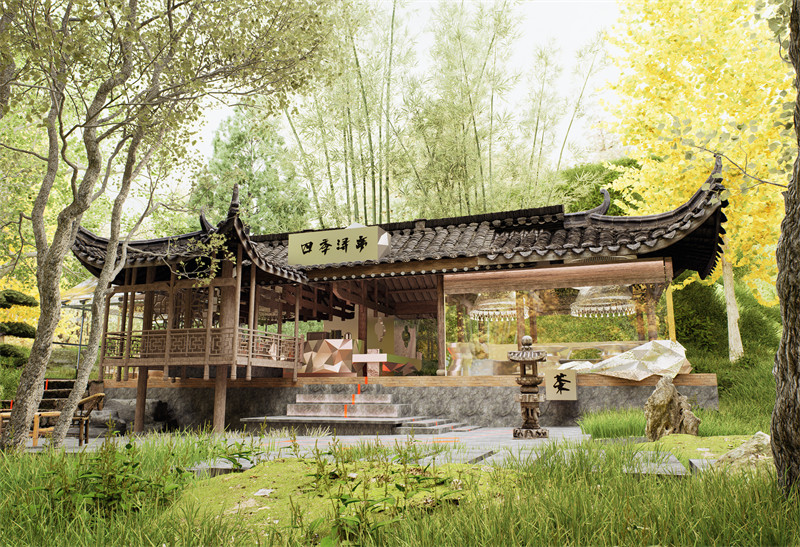 设计首先保留并修缮吊脚楼的主体结构,以保护其历史价值。同时在建筑旁新增一座现代玻璃房,采用整块可触控OLED玻璃作为外墙,实现内外空间的视觉与功能互动。室内外设计通过透明材质和动态投影技术的使用,让建筑融入自然环境,创造开放、通透的空间体验。