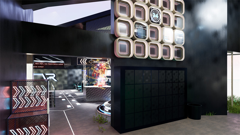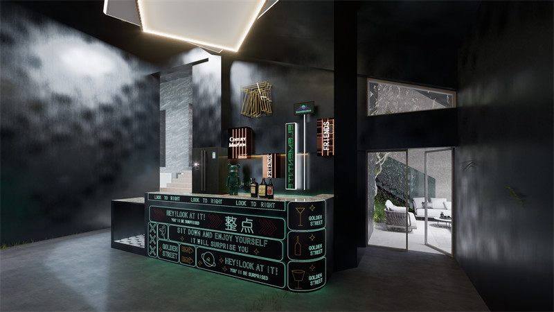 常规建筑入口都放置在正面,但是本项目位于公路一侧,直通入口未免落于俗套和臃肿,于是将入口置于后方并与沿途设置花镜作为过渡。单独的体块立于山坡上过于突兀,将潮玩分成两部分并以户外观景和吧台作为衔接则更为和谐。