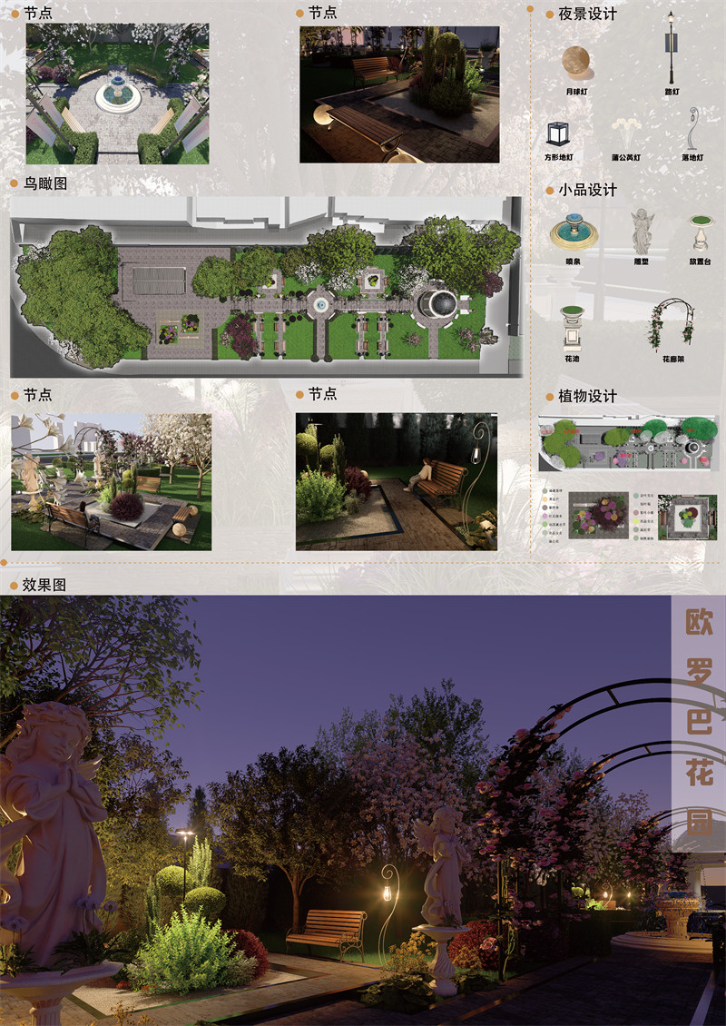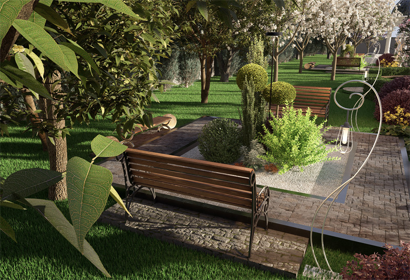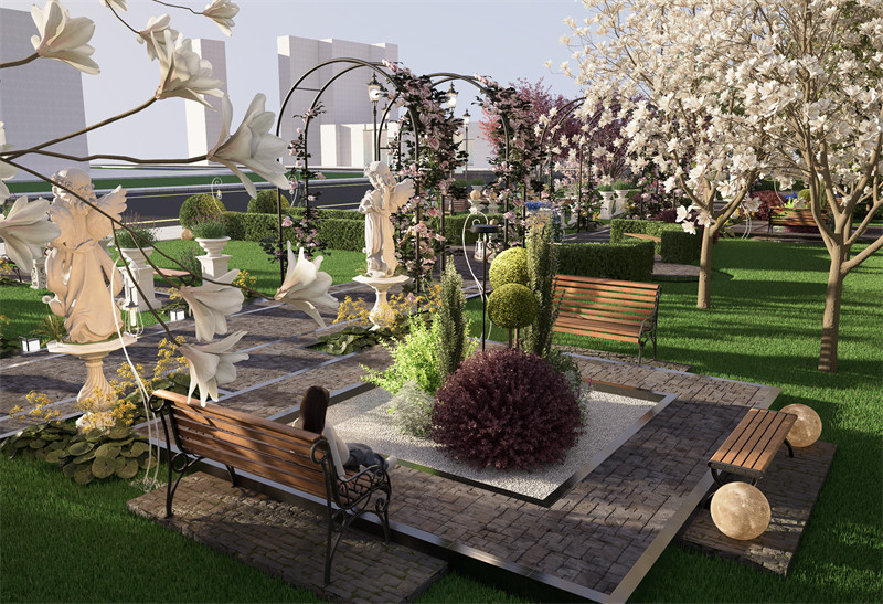 花坛的设计借鉴了法式园林的对称与几何美学,同时融入海派文化中对精致与细腻的追求,选用了如薰衣草等具有法式特色的花卉,搭配上园林中常见的桂花,樱花等,形成了独特的花卉景观。在小道的中央,一座以法式喷泉为蓝本打造的水景成为了整个区域的焦点。喷泉的水流潺潺而下,在阳光的照耀下闪烁着晶莹的光芒,为公园增添了灵动与生机。