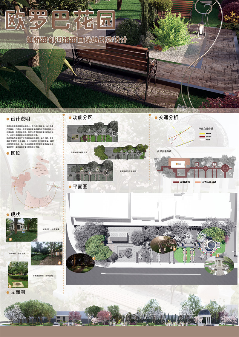 该地位于虹桥路剑河路口绿地位于长宁区虹桥路北侧,占地约2215平方米,内含一座200平方米的电站。这片原本普通的路口绿地,虽有绿植点缀,却缺乏鲜明的特色与足够的吸引力。绿地附近医院(上海申德医院)为欧式建筑风格,绿地主要服务人群为附近居民区(温莎花园)为法式建筑风格,绿地改造与周边建筑环境相关联,因此我们的设计小组秉持着将法式优雅与海派风情相融合的理念,开启了这场改造之旅。