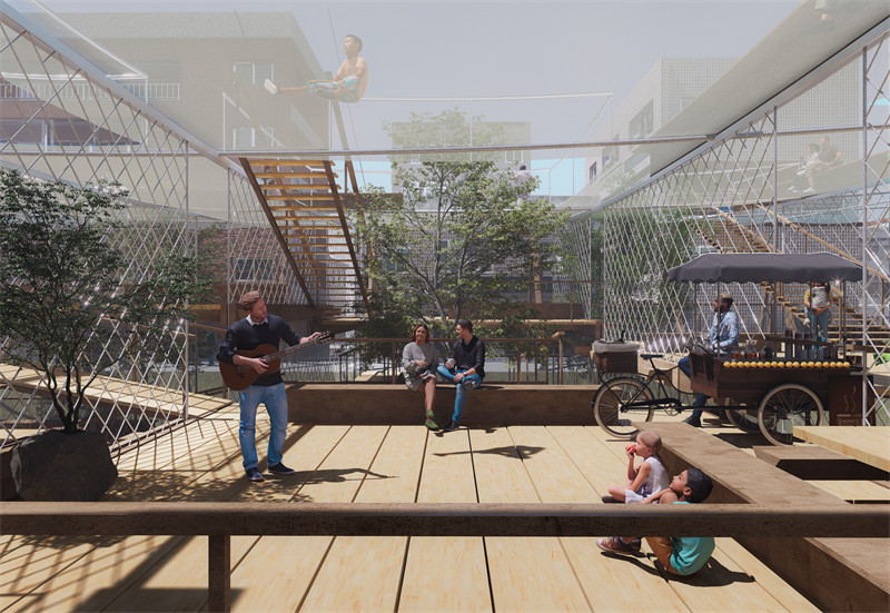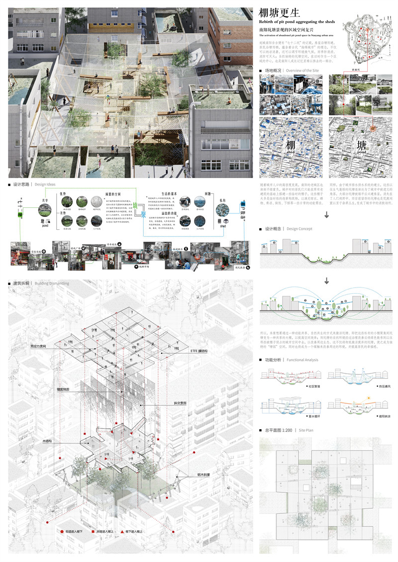 本案想要通过一种功能共享、自然共生的方式来激活遗留的坑塘空间区域。即把这些周边私有的小棚聚集到坑塘变为一种共享的棚塘空间,以提高利用效率;棚子自上而下生长,而坑塘生态系统经过治理恢复后自下而上生长,实现自然与生活的双向奔赴;这不仅将彻底激活废弃的坑塘,使之成为独特的“塘园”空间,同时也将成为一个媒触来改善周边的环境,并提高居民的幸福感,甚至让坑塘再生为南阳新时代的城市标志。