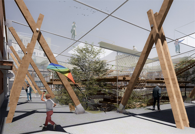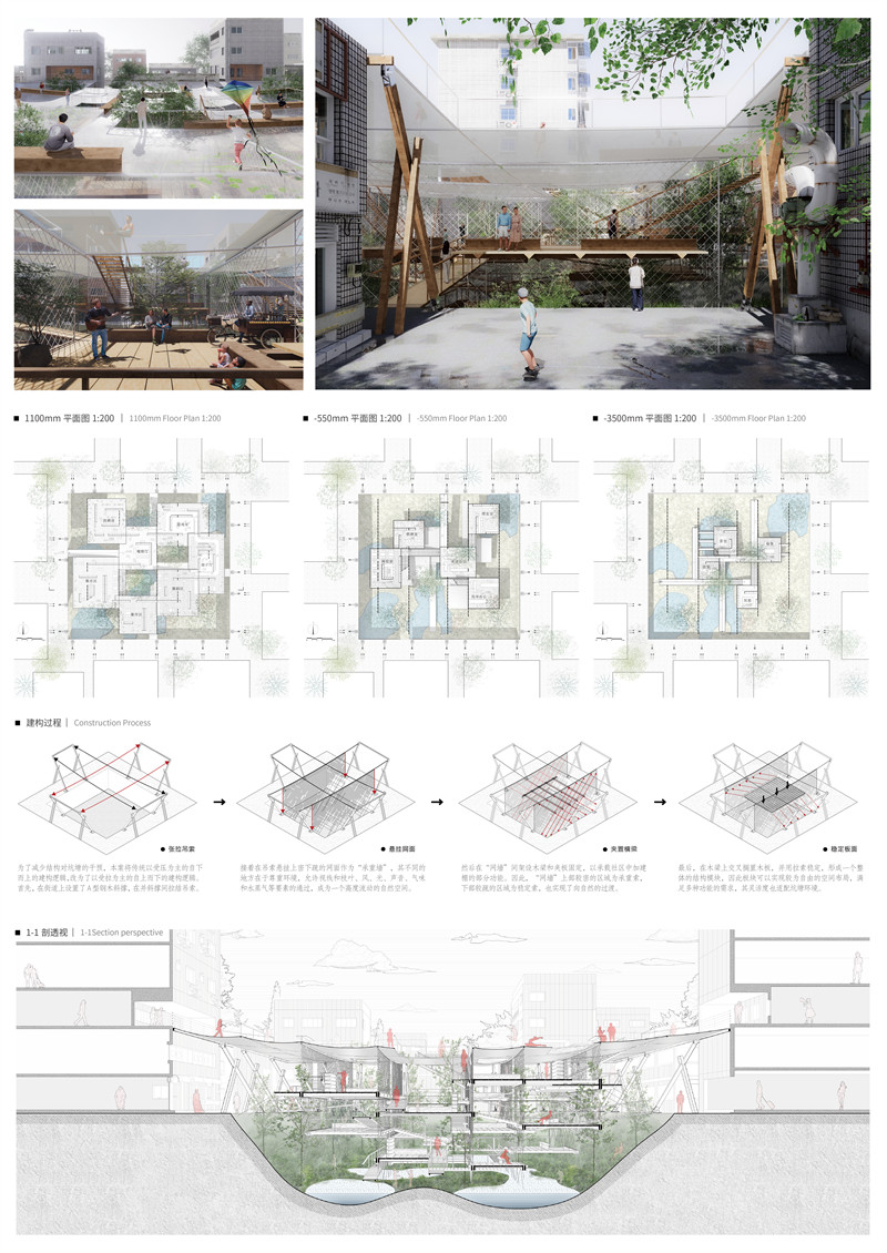 为了减少结构存在对坑塘的干预,本案将传统以受压为主的自下而上的建构逻辑,改为了以受拉为主的自上而下的建构逻辑。首先,在街道上设置了A型钢木斜撑作为主要竖向支撑构件,在并斜撑间拉结钢索作为主要横向支撑构件,类似与索网结构,分为承重索和稳定索;接着在索网下悬挂网面作为类似墙体的构件,最后在“网墙”间架设木梁和模板承载水平向功能布置。与传统混凝土墙相比,“网墙”不同的地方在于尊重空间,允许视线和枝叶、风、光、声音、气味、水蒸气等要素的通过,在满足当下功能空间需求的同时,成为一个彻底解放感官的暧昧的自然空间。