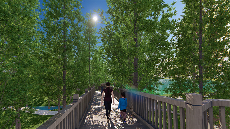- 在游园景观不到用下沉透明景墙进行湿地断层结构与湿地净化功能科普;